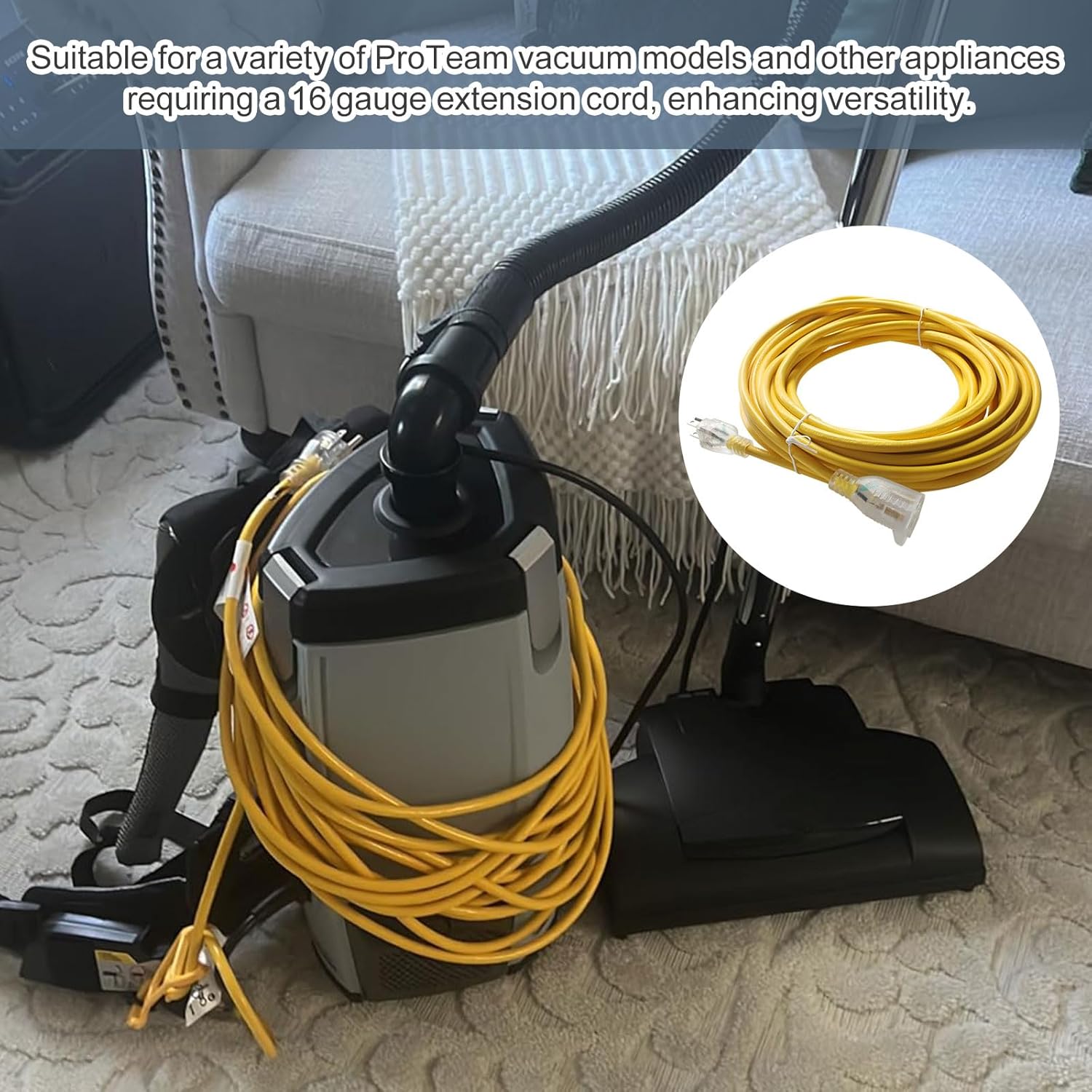 101678 Extension Cord Replacement for ProTeam Backpack Vacuum,50' 16 Gauge Yellow Power Cord Outdoor Use Fits 13A 125V 1625W Vacuum Parts. 101678 extension cord replaces model : 106782,107127,107146,107119,107118,107363,107303,107310,107325,100277,100280,103024. 50ft power extension cord compatible with: AviationVac、LinerVacer HEPA、LineVacer ULPA、Super Coach Pro 6、Super CoachVac、Super HalfVac Pro、Super QuarterVac、MegaVac、ProVac CN、ProVac FS 6、QuietPro BP、QuietPro CN HEPA、RunningVac、Super Coach Pro 10.