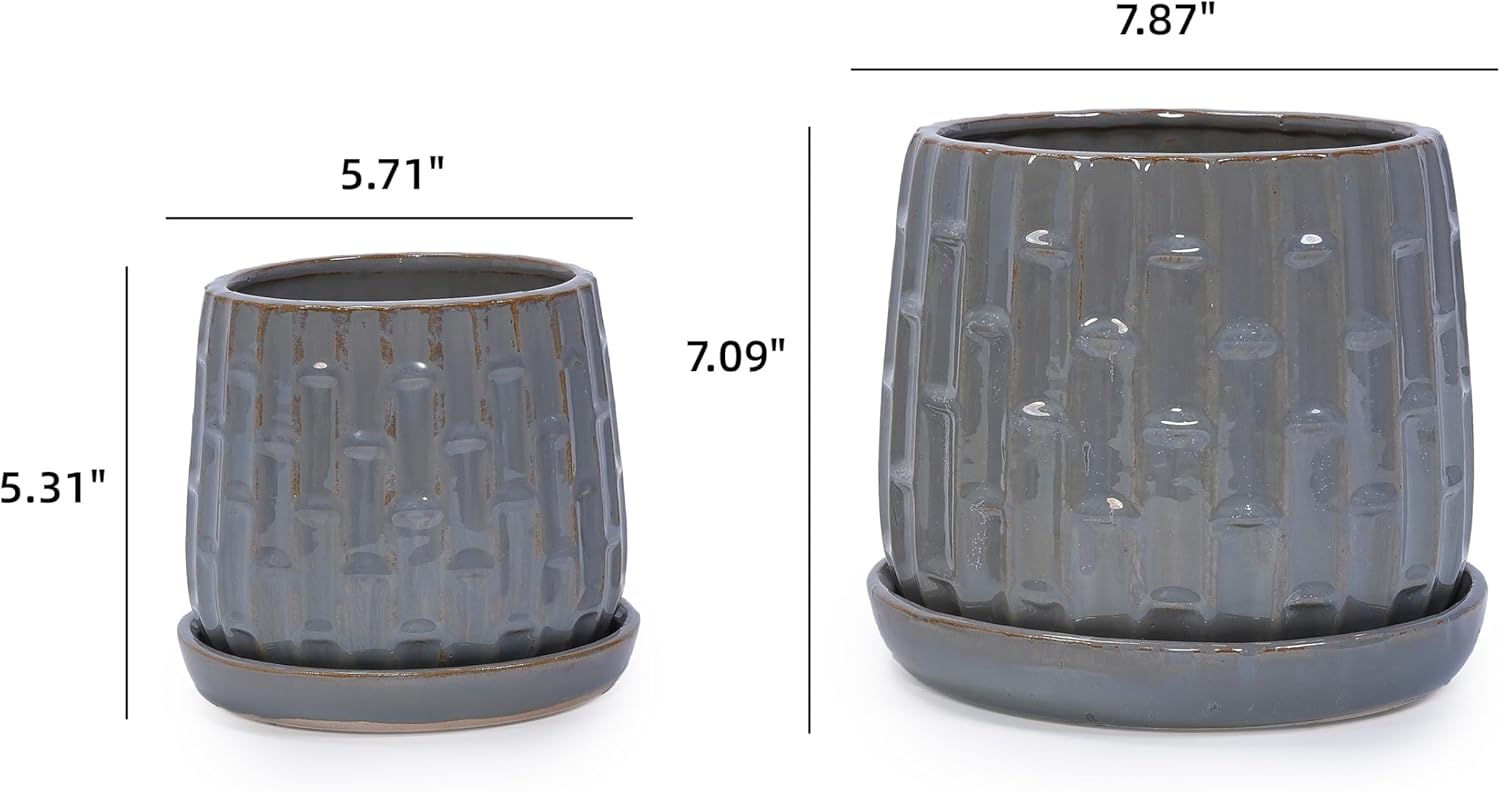 GM Ultra 2 Piece Ceramic Small Planter for Indoor Plants, 6/8 Inch Decorative Plant Pots with Drainage Holes and Saucers, Handmade Glazed Ceramic Flower Pots for Succulents, Orchids and HerbsKey Features:Complete 2-Piece Set: Includes 7.87” and 5.71” diameter planters, each with an attached saucer for flexible arrangements.All-Weather Resilience: High-fired ceramic resists fading, cracking, and peeling for versatile indoor/outdoor use.Breathable & Functional: Porous clay with drainage hole promotes air flow; saucer protects surfaces from water damage.Modern Minimalist Aesthetic: Available in black, white, or antique grey with vertical groove texture.Artisan Craftsmanship: Handmade variations ensure each piece is uniquely yours.Ideal for Various Plants: Perfect for succulents, herbs, orchids, and other small-to-medium plants.Specifications:Material: CeramicFinish: Glazed (black / white / antique grey) with groove textureCare: Wipe clean with a damp clothIncluded: Set of 2 planters with attached saucersStyle: Modern, minimalist, industrialPerfect For:Creating a clean, modern display on a sunny windowsill, office desk, or bookshelf.Adding minimalist style to living rooms, bedrooms, or patio tables without worrying about water spills.Gifting for housewarmings, weddings, or to friends who love easy-care, stylish plant accessories.Building a cohesive indoor garden that combines practical design with sleek aesthetics.