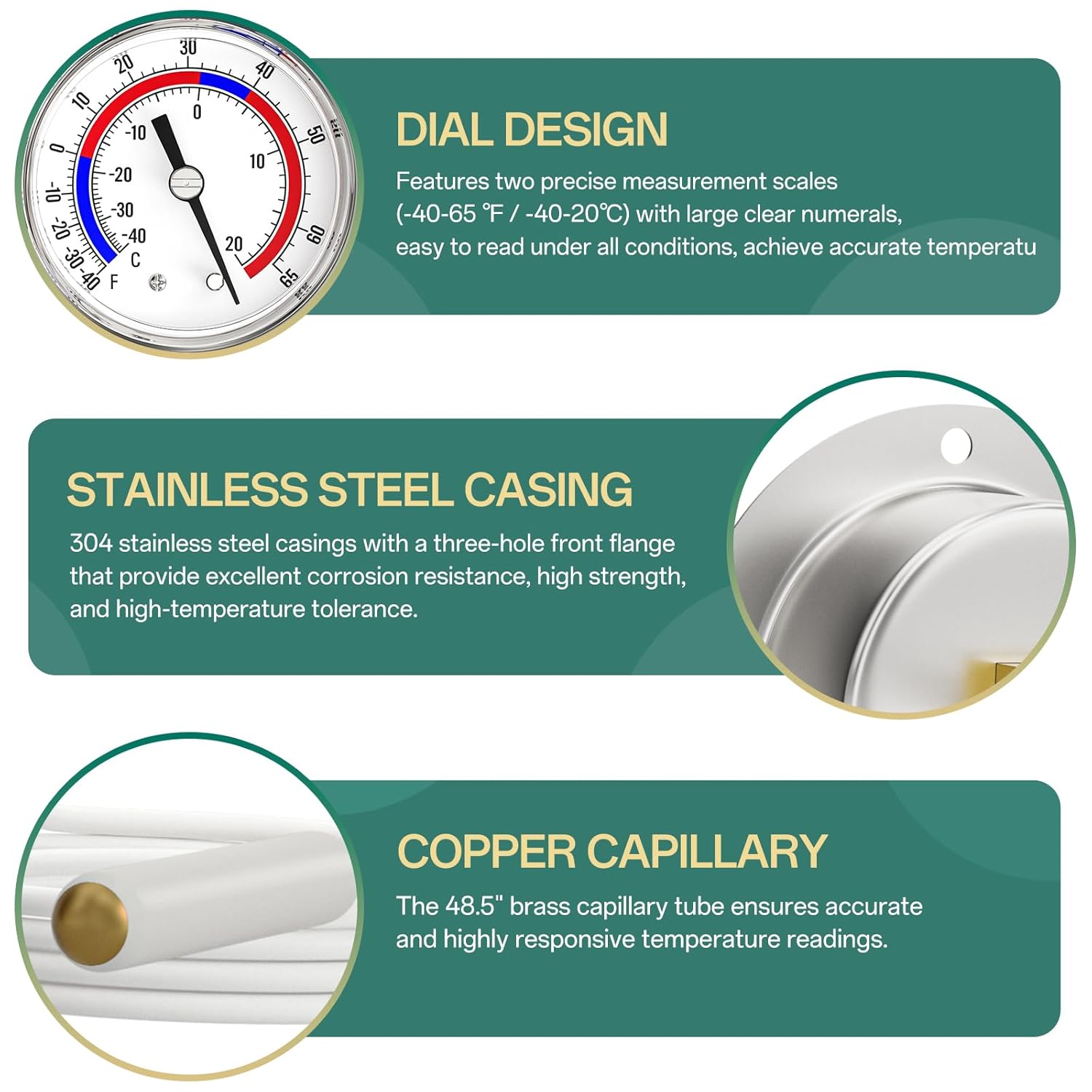 Product features:Crafted from durable stainless steel for superior wear and corrosion resistance, this gauge features liquid-filled technology that dampens vibration and eliminates bubbles for clear, stable readings and a long service life. The precision sealing design further ensures leak-proof operation and consistent accuracy.Product specifications:Product Name: Vapor Capillary Refrigeration ThermometerSize: 2" dial size, 48" capillary lengthDurable Construction, Precision Sensing: Stainless steel exterior resists corrosion while a brass capillary tube ensures accurate, responsive temperature readings.Temperature Range: Operating reliably in temperatures from -40-65°F/-40-20°C, dual scale.Accuracy: 2%Application Scenarios:Suitable for Cold Storage, Display Cabinet, Freezer, chilled system, etc.Packaging content:2 x Vapor Capillary Refrigeration Thermometer6 x Phillips screw M3.5*20