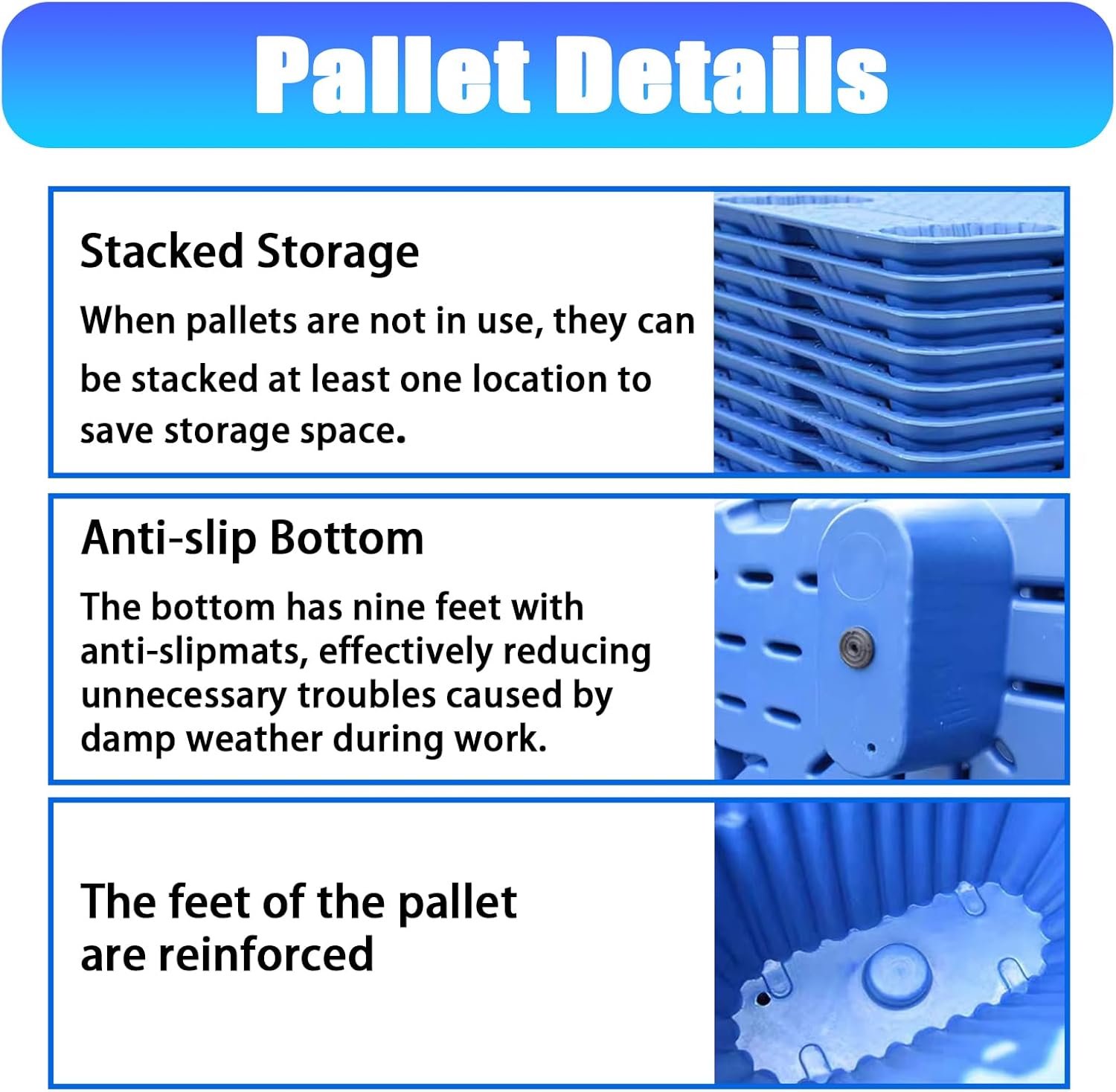 3 Pack Heavy Duty Blue Plastic Pallets 48x40 Inches – 3300lb Dynamic & 6600lb Static Load Capacity, 4-Way Entry Plastic Pallets for Storage, Basement and Outdoor Use