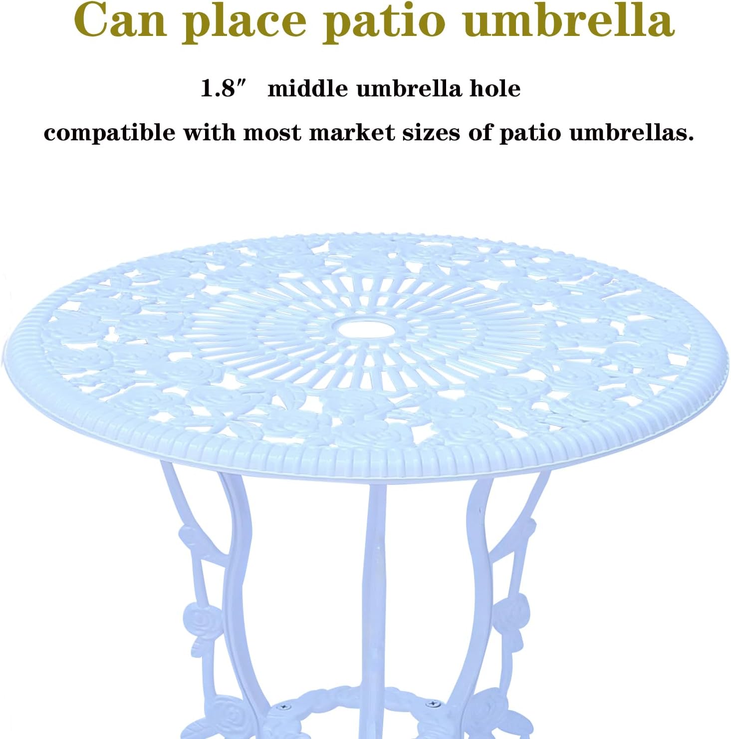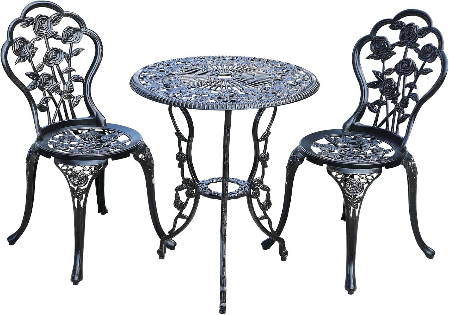 Transform your outdoor space with this elegant 3-piece cast aluminum bistro set, perfect for intimate garden gatherings or morning coffee on the patio. The set includes two intricately designed chairs and a matching round table with a convenient umbrella hole. Crafted from durable cast aluminum, each piece boasts a beautiful lattice pattern that adds a touch of sophistication to any outdoor setting. The chairs provide comfortable seating with their ergonomic design, while anti-slip foot caps ensure stability on various surfaces. The robust metal construction withstands various weather conditions including sunshine, rain, and snow, making it ideal for year-round outdoor use. The table's sturdy legs and solid construction provide excellent stability, while its classic design complements both traditional and contemporary outdoor décor. This compact yet stylish set is perfect for small patios, balconies, or as an accent piece in larger outdoor spaces. The timeless bronze finish adds a refined touch while helping to mask wear and tear from regular use.