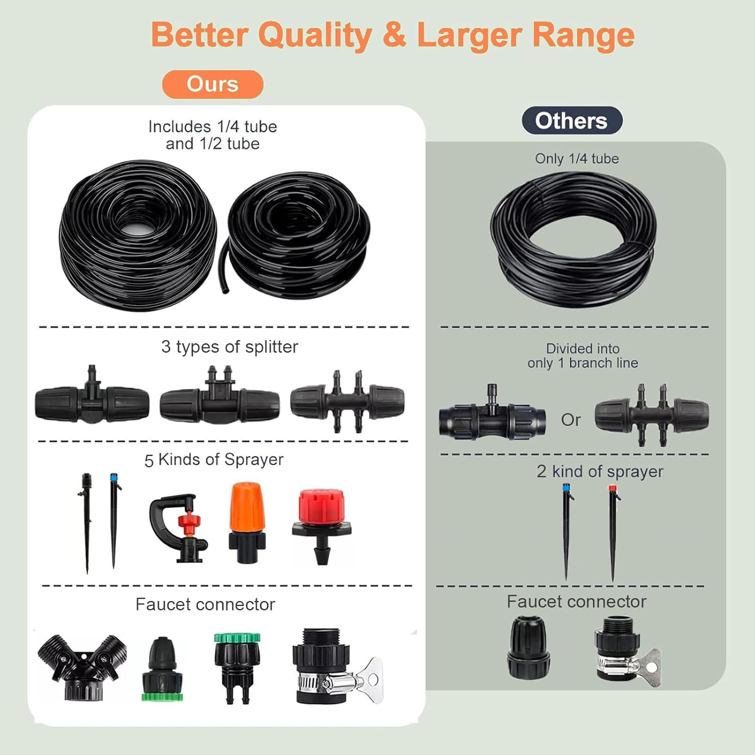 • 164FT DRIP IRRIGATION KIT: The garden watering for plants system kit include 33FT main tubing (1/2"),131FT distribution tubing (1/4"), it comes with totally 302 parts and we offer enough accessories for you to build up 3 sets small drip irrigation systems or 1 set garden watering system