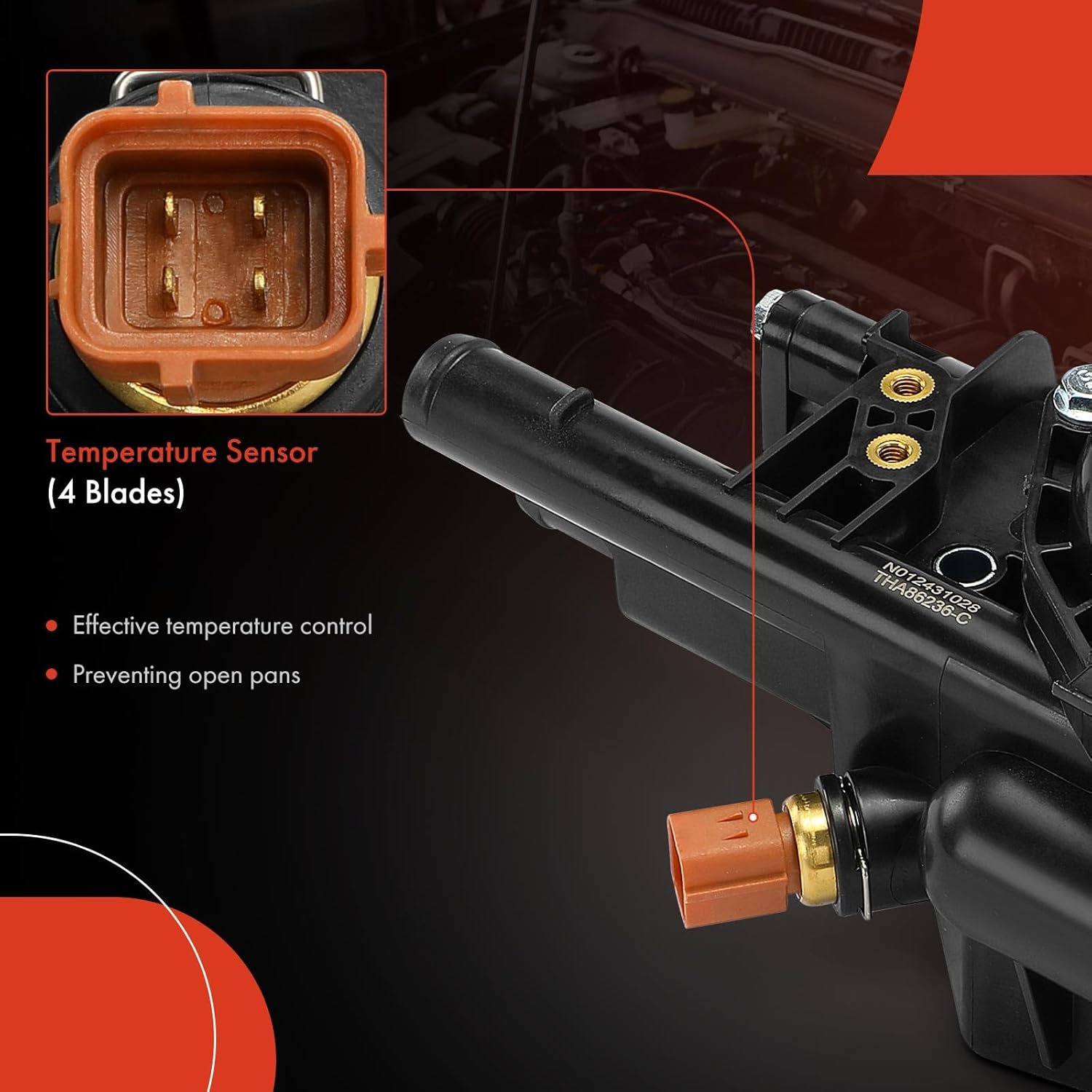 A-premium Thermostat Housing Assemblies are an ideal choice to replace your broken Thermostat Housing Assemblies. All Thermostat Housing Assemblies meet or exceed OEM specifications. Due to high manufacturing standard, it will come with one year quality guarantee. Compatible with Hyundai Models: 2009-2010 Sonata L4 2.4L Compatible with Kia Models: 2009-2010 Optima 2009-2010 Rondo Specifications: Material: Plastic Thermostat Included: Yes OEM Number: TA1089, 86236, 256002G600 Quantity Sold: One Piece Note: Temperature: 82℃/179.6F; It comes with Thermostat and Sensor; 2009-2010 Kia Rondo L4 2.4L, fits the model To 12/28/2009