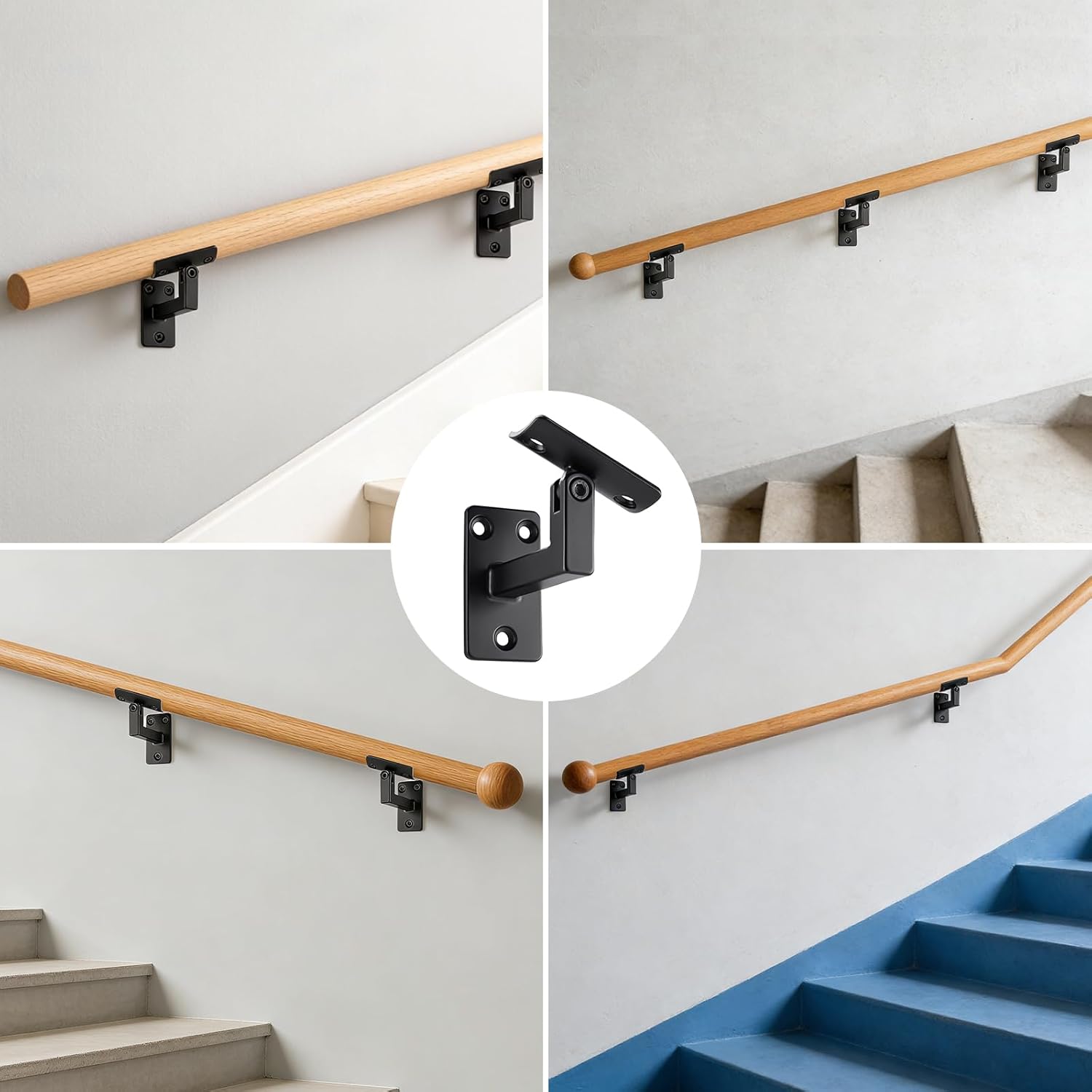 Professional-Grade Adjustable Handrail Support SystemThe Patioer Adjustable Swivel Handrail Bracket provides a versatile and secure solution for installing round handrails on staircases, ramps, and walkways. With its innovative 3-point mounting system and fully adjustable swivel design, this bracket accommodates various installation angles while ensuring maximum stability and safety.Complete Installation PackagePack Quantity: 4 Adjustable Handrail BracketsBracket Size: 3 Inch Support ArmMaterial: Heavy-Gauge IronFinish: Matte Black Protective CoatingAdjustment Range: 0-270 Degree SwivelRailing Compatibility: Round Handrails 1.5" - 2" Diameter (38-50mm)Included Hardware: 12 Long Wall Screws, 8 Short Railing Screws, 12 Plastic AnchorsMounting System: 3-Point Base Plate DesignFully Adjustable Swivel MechanismThe patented swivel design allows you to adjust the bracket angle during installation to perfectly match your staircase's incline. This feature is particularly valuable for:Custom staircase designs with non-standard anglesRetrofit installations where existing conditions varyAccommodating slight wall irregularitiesAllowing for precise handrail alignmentSpecialized Round Railing DesignEngineered specifically for round handrails, these brackets feature:Curved Contact Surface: Contoured to match the radius of round railingsUniversal Sizing: Accommodates standard round handrails from 1.5" to 2" diameterMaterial Compatibility: Works with both wooden and metal round handrailsStep-by-Step Installation GuidePlan Layout: Determine bracket spacing (typically 24-36 inches along the handrail)Locate Studs: Use a stud finder to identify wall studs for optimal mountingMark Positions: Mark bracket locations ensuring all three mounting points align with studsInstall Brackets: Secure brackets to wall using provided long screws (pre-drill if necessary)Adjust Angle: Loosen swivel mechanism, set desired angle, then tighten securelyAttach Handrail: Place handrail in bracket, secure with provided short screwsFinal Check: Test stability by applying downward pressure on the handrailTechnical SpecificationsOverall Dimensions: 3.1" x 3.1" x 1.37" (L x W x H)Weight Capacity: Rated for standard residential and commercial handrail loadsMaterial Thickness: 4mm heavy-gauge ironSurface Treatment: Electrostatic powder coatingTemperature Range: -40°F to 200°F (-40°C to 93°C)