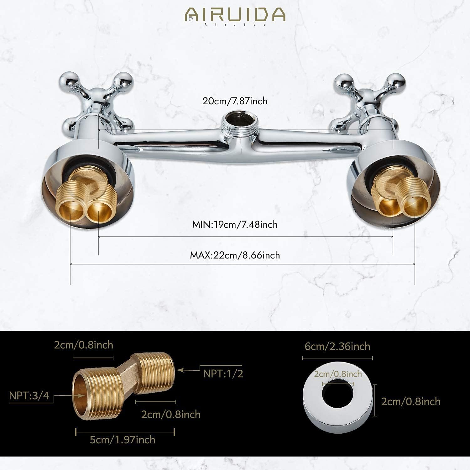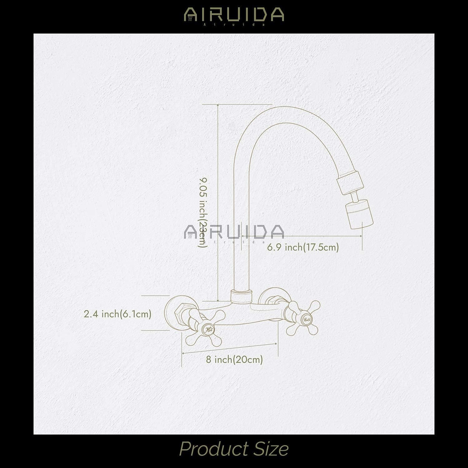 Product descriptionWall mount 8 Inch center kitchen sink faucet with 360-degree twist.Solid brass construction, chrome polish finish prevent to be discolored, rusty for long time daily use.[Material]:Manufactured from solid brass with Lead-Free Waterway for sturdy and heavy-duty.strong tarnish and corrosion resistance.It will not leak.[Design]:The spray head designs with 360-degree twist which rinses to every corner of the sink.Powerful spray perfects to flush the food debris easily.[Function]:The hot and cold mixer valves with two cross handles for control the temperature and water flow.[Installation]:Wall mount kitchen sink faucet.Easy for installation.Come with installation instruction.[Warranty]:Promises lifetime warranty, Any problem with this faucet, please contact us, provide any replacement in future use.Details:Spout Reach: 6.8 inch Overall Height: 9 inch Center Distance: 8 inch The head can be rotated to reach the biggest angle of 82 degreeAbout size: All dimensions are measured by hand, there may be 1-3cm deviations. Pls allow a little measurement differ due to manual making.