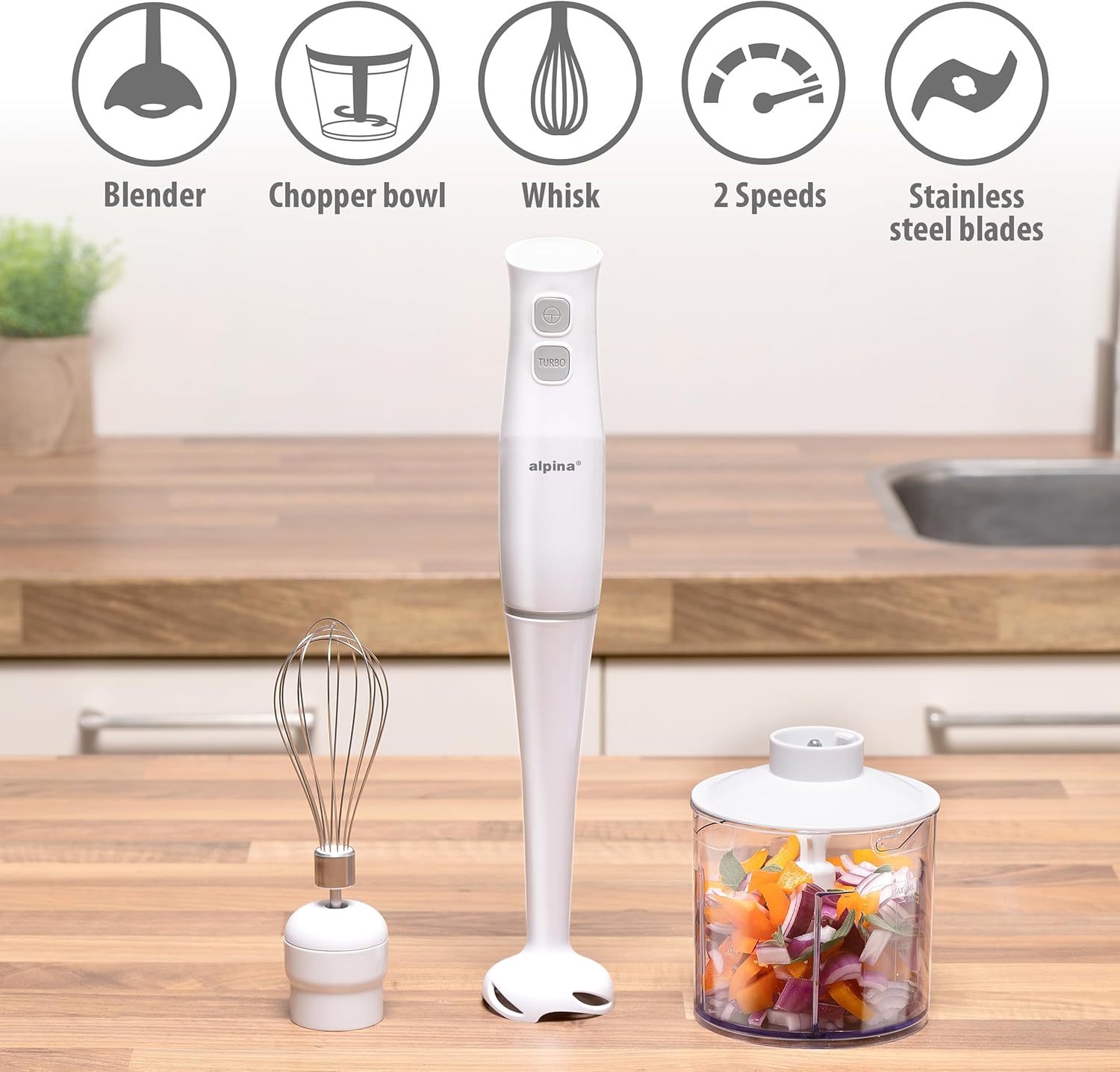 | Included Components | 3 accessories, puree, mixer for whipping whites and assembled cream, chopper for chopping meat or garlic paste |