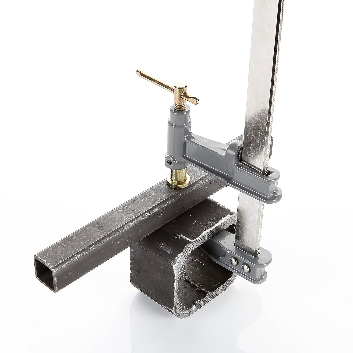Manufacturer's reference: \"197800. Description one-piece plunger jaws of nodular cast iron painted rim and double clamp with steel rivet snap in \"T\" handle for safety. Brake serrated and hardened spindle with double thread Trapezoidal for large comes calibrated steel rim and notched on both sides. Bright Chrome