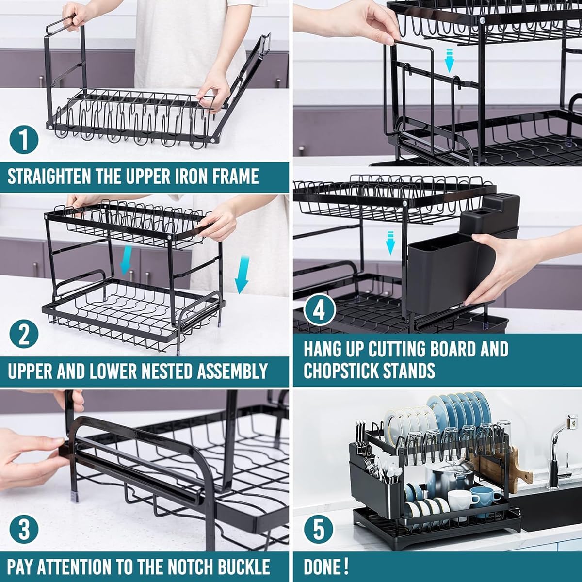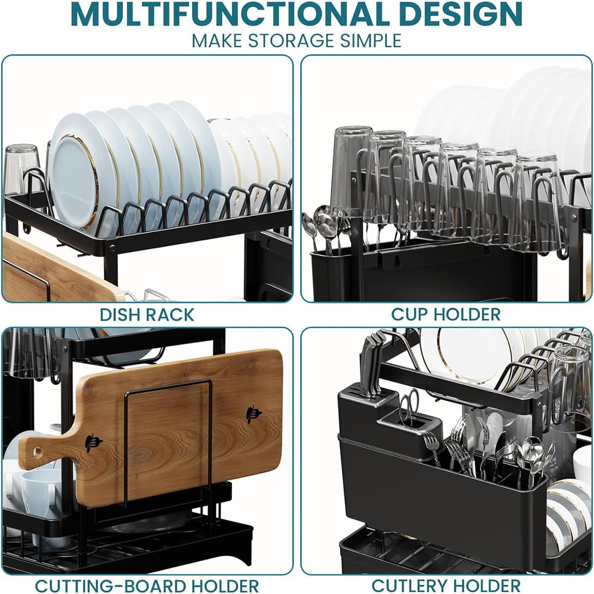 Upgraded Innovative Rapid Drainage System Our Dish Drying Rack has an integrated drain plate and a swivel spout that can be rotated 360° for three drainage directions has been used in any kitchen design to keep water flowing directly into the sink. The dish dryer rack has a rubber stopper, remove to drain water, insert to hold water, and quickly drain water for 30 seconds to keep the countertop dry. Are you the kitchen organizer still bothered by messy and damp dishes on the kitchen counter? Our new upgraded extra large dish drying rack is designed with 304 stainless steel and has enough space for cutlery, plates, bowls, glasses, cutlery and more. Kitchen cutlery racks with drain plate kits drain dishes, prevent rust, and keep countertops dry and tidy.