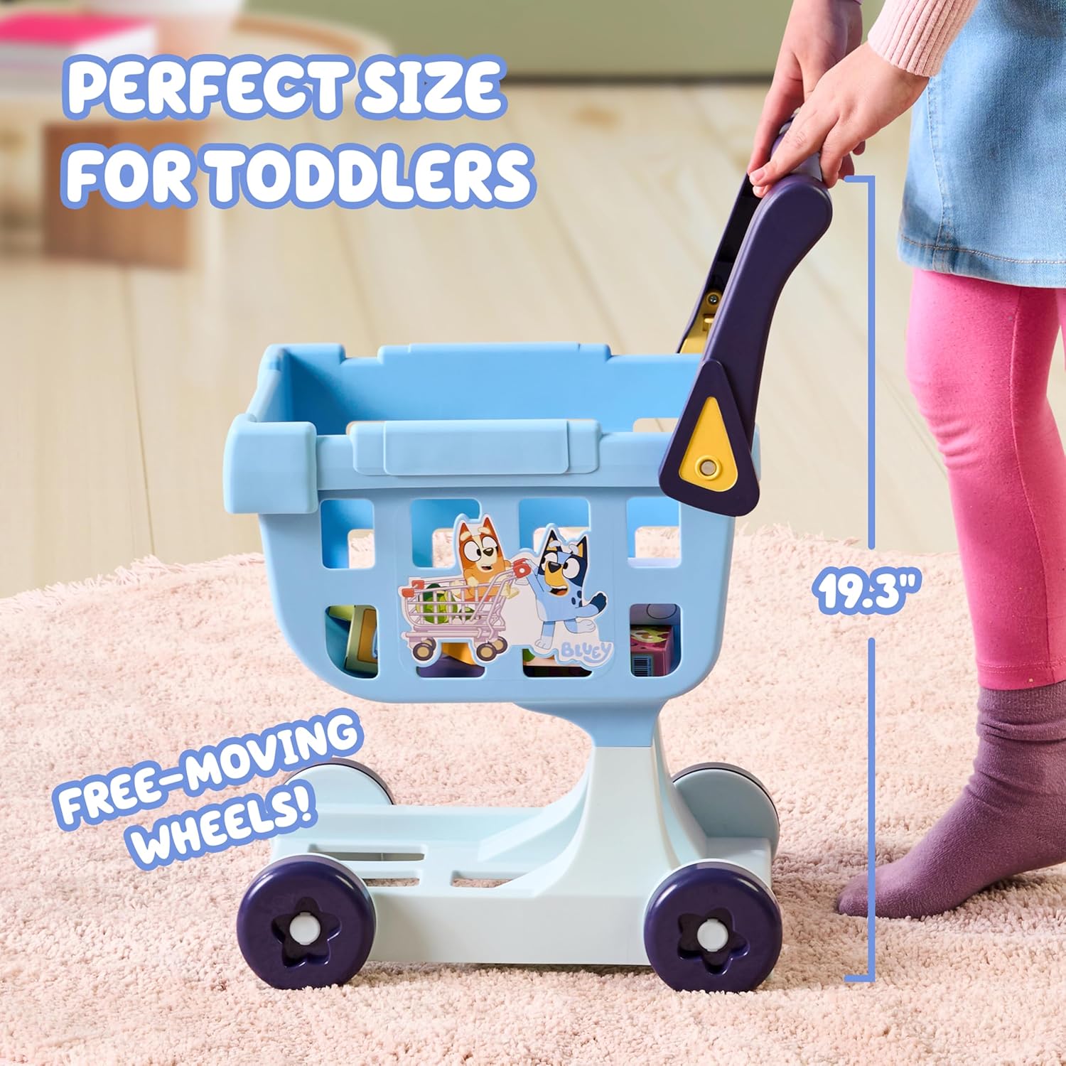 Bluey Shopping Cart for Kids: Bring the excitement of a real shopping trip into your child’s playtime with our Bluey kids shopping basket that lets little ones shop just like Bluey and Bingo. This toddler shopping cart includes 8 colorful cardboard grocery items so kids can fill their cart and enjoy a realistic shopping spree. Built with free rolling wheels and a foldable handle, this grocery cart for kids is lightweight and easy for toddlers to push or carry, making it perfect for both indoor and outdoor adventures. Standing 19.3 inches tall, this toddler grocery cart is perfectly sized for little hands to push and explore, helping to foster creativity, problem solving, and storytelling skills as they play. For an even more immersive experience, this kids push cart is perfectly compatible with the Bluey cash register so children can combine both toys for imaginative checkouts and roleplay that brings Bluey’s world to life. Designed with kid-friendly, safe materials, this kids shopping playset is easy to handle and ideal for preschoolers and toddlers aged 3 and above, ensuring endless playtime fun.