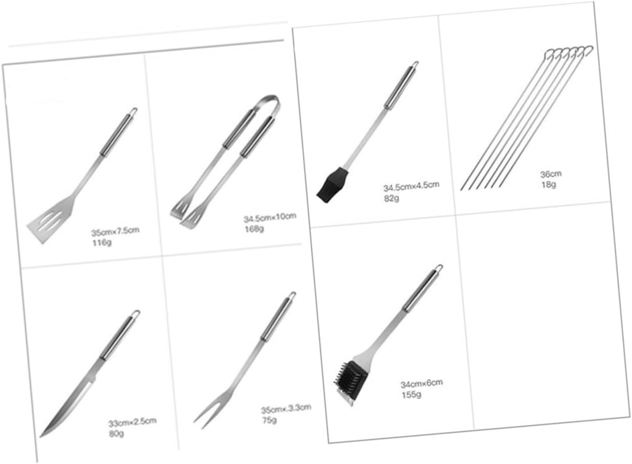 Package List 1 x Spade 2 x Brush 1 x Fork 1 x Knife 1 x Clamp 6 x Grill Skewers 1 x Storage Bag Characteristics - Material: Stainless steel, silicone and cloth grill accessories for BBQ - Size: About 40x16.5x6cm BBQ tools - Color: Black - Includes spade, clamp, knife, fork, brush, steel brush and skewer stainless steel BBQ utensil - Put these tools into a bag, you can easily store this BBQ set and each tool is neatly organized, carry outdoor and put into the car barbecue tools kit. - A great foodies, barbecue fans, cooks, camping lovers barbeque accessories with storage bag. - Handy BBQ tool to make your barbecue more convenient and fun. - Enjoy a happy and easy barbecue time and delicious food with this tool kit.Goods Informationbarbecue tools kit suitable for outdoor barbecue or home use.barbeque accessories with storage bag This set tools is well made of stainless steel material for and use.grill accessories for BBQ enjoy a happy and easy barbecue time with your friend or family etc.stainless steel BBQ utensil With a handle storage bag, can carry them easily