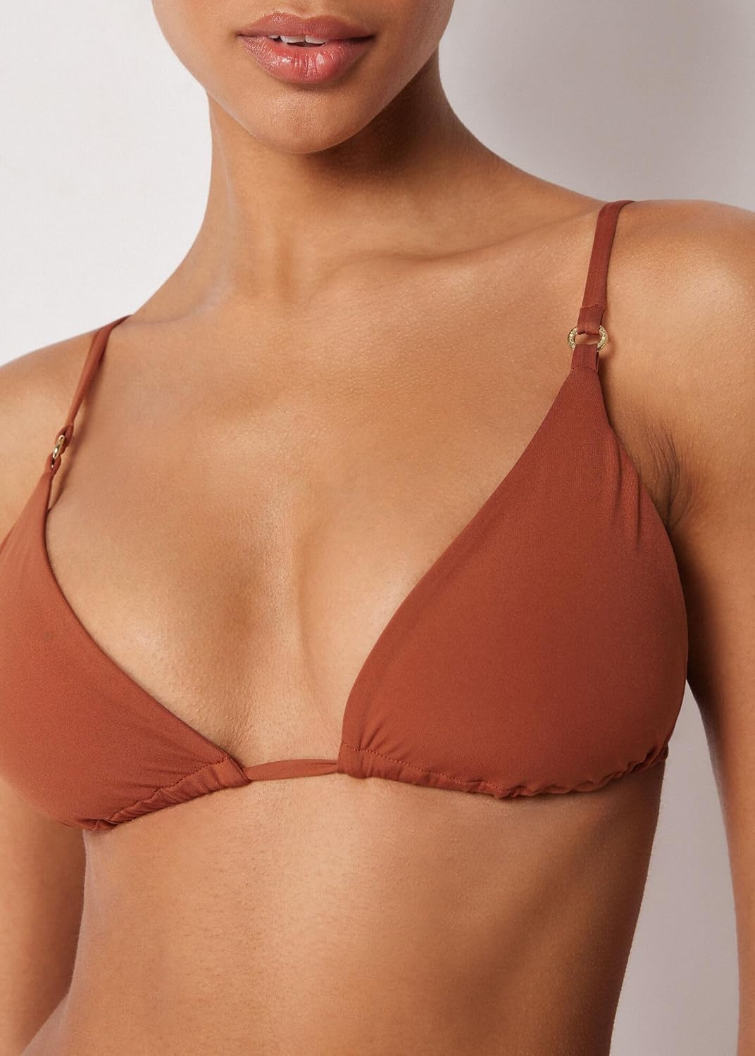 Wireless triangle bikini top with removable padding. The soft fabric provides a comfortable fit and feels light on the skin. The shoulder straps have eyelets on the ends so they can be hooked onto the back band or tied around the neck. Back thin tie closure.