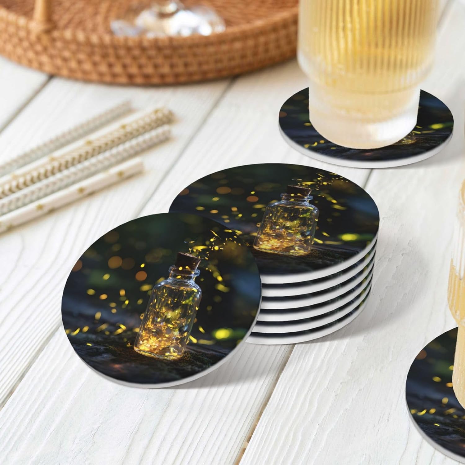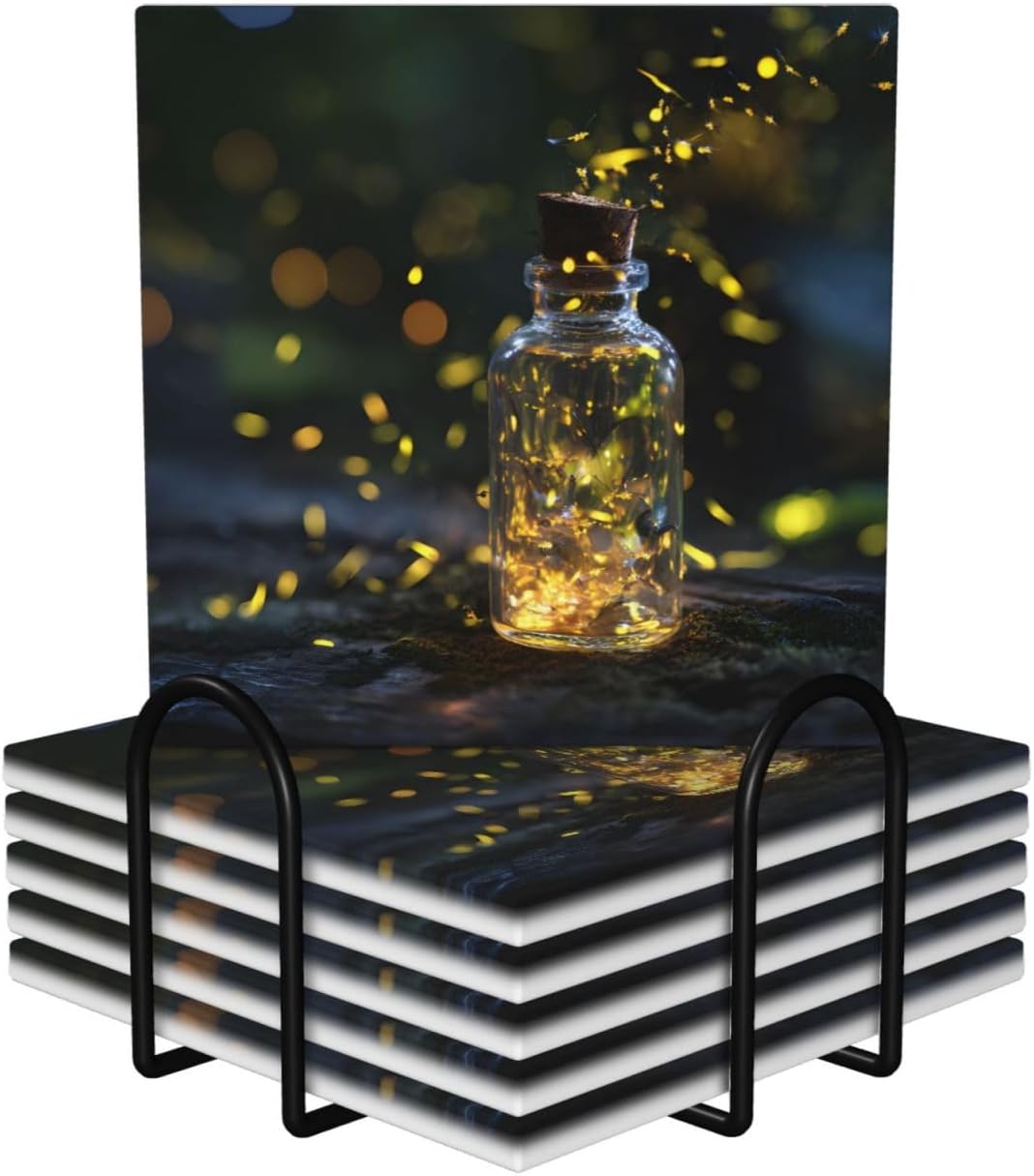 Product Name: DCEHGEW Ceramic Drink CoastersMaterial Type: Ceramic with cork bottomSize: Round: 4.1 x 4.1 inches, Square: 3.9 x 3.9 inches, Hexagon: 4.3 x 3.7 inchesPattern: Fireflies About Our Ceramic Absorbent Coasters:Product Features - Crafted from high-quality ceramic, these coasters are odorless and eco-friendly. Their superior absorbency keeps your surfaces dry by quickly soaking up spills from coffee, cola, and other beverages within 10-15 seconds.Applicable Scenarios - Perfect for adding a stylish touch to your kitchen, living room, bar, hotel, or restaurant. These coasters are an ideal present for birthdays, Mother's Day, Father's Day, Valentine's Day, anniversaries, housewarming celebrations, or Christmas.Accessory Structure - Each set includes 6 ceramic coasters with cork bottoms, accompanied by a sleek black metal stand for organized and aesthetic storage. Choose from three different shapes to suit your style and needs.Washing Instructions - Easily clean these coasters with water or a damp cloth.Special NoteDue to different measurement methods, a deviation of up to 0.3 cm in size is considered normal.Please Note:The product images are for reference only. Actual products may vary slightly due to production factors such as batch differences and machine settings. Minor variations in color, position, and size are normal and not considered defects. Thank you for your understanding!Customer Service:We want to make sure you have an amazing experience with us. Please contact us with any feedback you may have. We love to hear from you and usually respond within 12-24 hours.