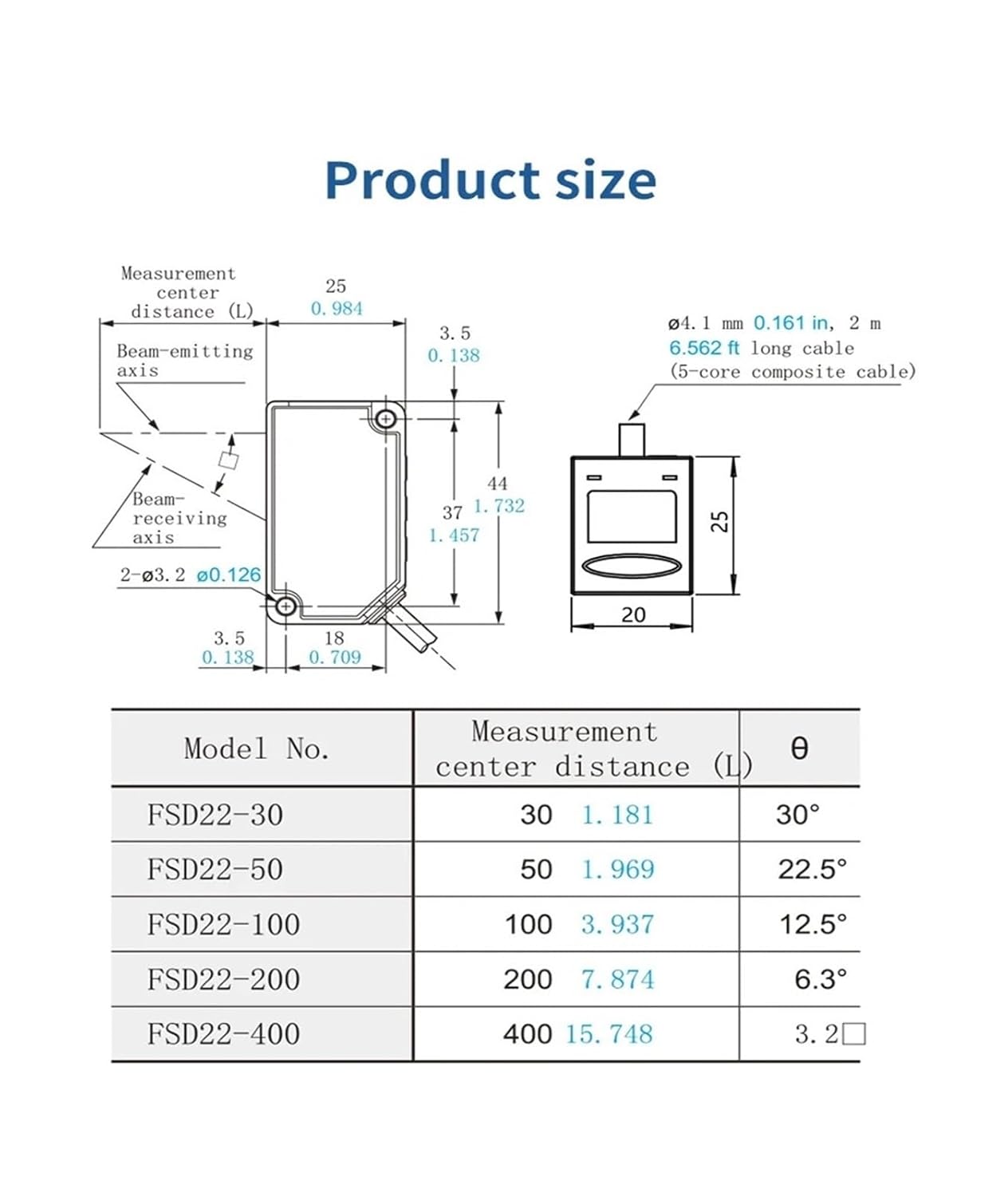 Is_customized : YesTheory : Optical SensorMaterial : MetalType : Optical-Electronics SensorOutput : Analog SensorOrigin : Mainland ChinaUse : Distance measurement; Thickness detectionMeasurement center distance : 50mmMeasurement range : ±15mmBeam diameter : 70mRepeatability : 30mLinearity : ±0.3%F.S.output : NPN/analog 0-5V/4-20mA