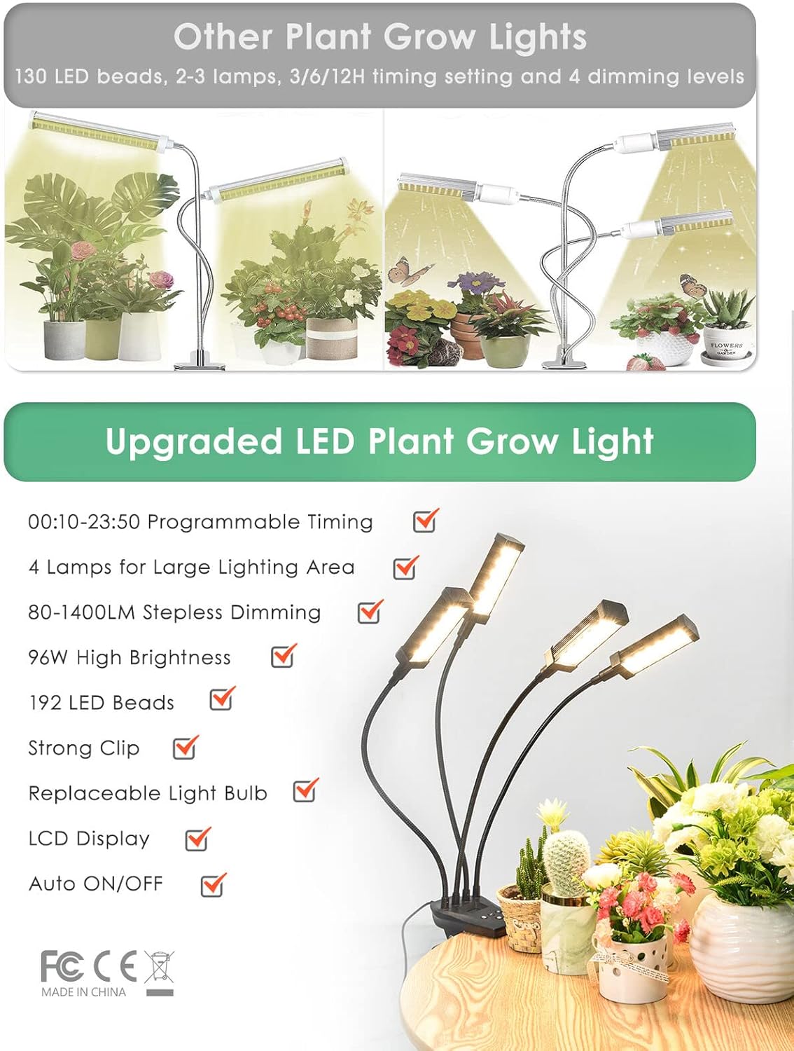 Boost your plant's growth with the Full-Spectrum LED Plant Grow Light, designed to provide optimal light for every stage of plant development. Featuring 192 LED beads, this grow light delivers a balanced spectrum, promoting healthy growth from germination to flowering. The 4-head design allows you to direct light to multiple plants, ensuring even coverage and maximum efficiency. With adjustable timing settings ranging from 10 minutes to 23 hours, you can customize the light duration to suit your plants' unique needs. The built-in automatic on/off memory function ensures that your plants are well-cared for, even when you're not around. Plus, with stepless dimming and replaceable bulbs, this grow light is both versatile and durable, providing up to 50,000 hours of service. Whether you're growing indoor flowers, herbs, or vegetables, this grow light is the perfect solution to supplement natural sunlight and enhance your plant's vitality.