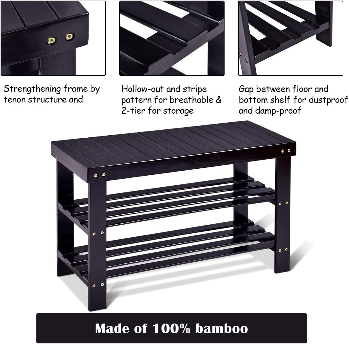 This shoe bench helps you find your suitable shoes quickly for today’s schedule in morning. And you won't feel anxious and angry for seeing the situation that shoes are put in disorder by your naughty kids anymore. This shoe rack can allow you to organize your shoes and make your room tidy. When you sit on the top of this bench, you will find it very steady and stable because it is made of sturdy 100% bamboo material and reinforced by premium hardware. Don't hesitate to buy one!