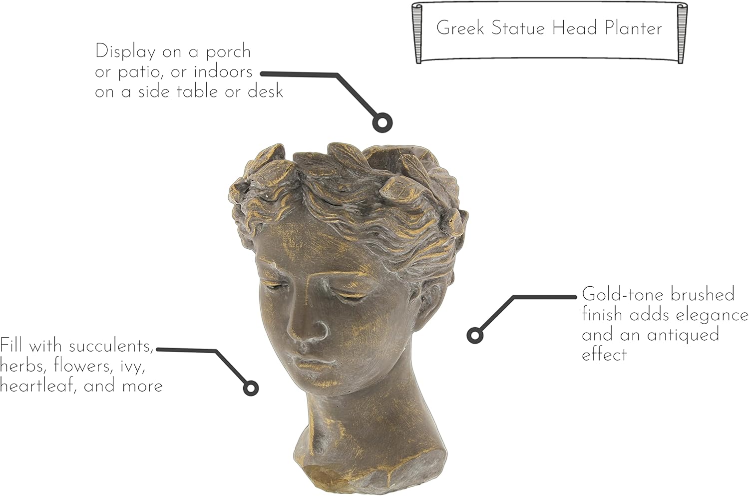 Create a unique and stunning plant display with this Greek goddess statue planter pot. A bronze-tone finish on the matte cement stone adds even more style and flair. Measures 10.5" tall. Plastic liner included - does not feature a drain hole.