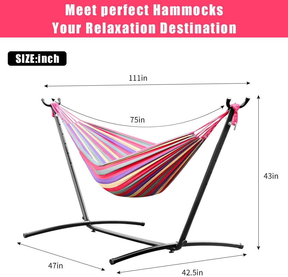 Meet perfect, you will enjoy the freedom and comfortable life !Feturers: Canvas Dimensions: 118 x 75 inch, spacious enough for two person; Weight capacity is up to Approx 136 kg / 300 lb. Indoor and outdoor camping hammock swing with stand. Suitable for travel,patio, park, seaside, forest, courtyard, dormitory and so on. It is perfect for adult or children to play and relax comfortably. Wonderful Christmas gift or other festival gift for you and your loved person.Advantages: 1) With balanced bottom design, it allows hammocks to be set up and taken down anywhere you like. 2) The stand is constructed with heavy duty powder-coated steel, which can gives you strong support and ensure durability. 3) With easy and convenient installation, it can be set up at any flat place. 4) Designed for both outdoor and indoor use, the height adjustable protable hammock stand can meet your needs for your required height and place. 5) We are so confident in the supreme quality of our hammock stands that we will provide 100% services for you.Box Contains: 1 x hammock 1 x hammock stand (simple assemble required, necessary tools included) 1 x Bonus black carrying case 1 x Assembly InstructionsGreat purchasing and happy communication with each other.You will be swinging in peace!