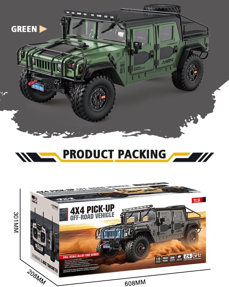 ※Hg P415A Pro 4X4 Rc Off-Road Vehicle For 1:10 Pick-Up Crawler Sound Light ※Note: Smoking oil cannot be sent by international express. You need to buy smoke oil (ethylene glycol) locally. ※Specification: Brand: Hg Item Condition: New Material: Metal, Plastic Size:49.5X26.7X21.7Cm Wheelbase: 329Mm Recommended Battery: 7.4V 3000Mah/4500Mah Li-Po Battery (Not Included In The Package) Id: Hg-P415A-Pro-Sd-Led-Gn ※This Product Includes: 1/10 Model Body Esc Motor Servo Light System Sound System Roof Light Winch Simulation Licence Plate Smoke Unit User Manual Radio System Accessories Bag ※This Product Does Not Include: Battery Charger Features: 1. The New 570 Class Brush Motor (12500 Rpm, Built-In Fan, Strong Magnet, Double Bearings) Can Effectively Reduce The Torque Attenuation Caused By The Heat Generated By The Motor During Operation. 2. 9Kg Waterproof Alloy Gear Digital Steering Gear. 3. 45A Esc: It Can Switch Between Braking Mode And Non-Braking Mode, And It Can Switch Between Li Po And Ni-Hm Battery Protection Modes. A. Esc Is Equipped With Low-Voltage Protection: When The Battery Voltage Is Too Low, The Power Regulator Will Start The Power Failure Protection. B. High-Temperature Protection: When The Working Temperature Of The Electric Regulator Is Higher Than The Set Value, The Electric Regulator Will Start The Power-Off Protection; When The Temperature Drops To The Normal Value, It Returns To Normal. 4. Independent Suspension Structure And Wheel Reducer Structure Are Also Adopted. This Kind Of Suspension Has Better Elasticity, Can Absorb Road Vibration, And Can Drive Stably At High Speed. 5. The Manual Differential Lock Structure Enables The Front And Rear Axles To Lock And Unlock The Differential Independently To Meet The Driving Needs Of More Terrain. 6. The Adjustable Shock Absorber Can Obtain The Best Shock Absorption Effect By Adjusting The Compression Or Release Spring Length Of The Shock Absorption Ring.
