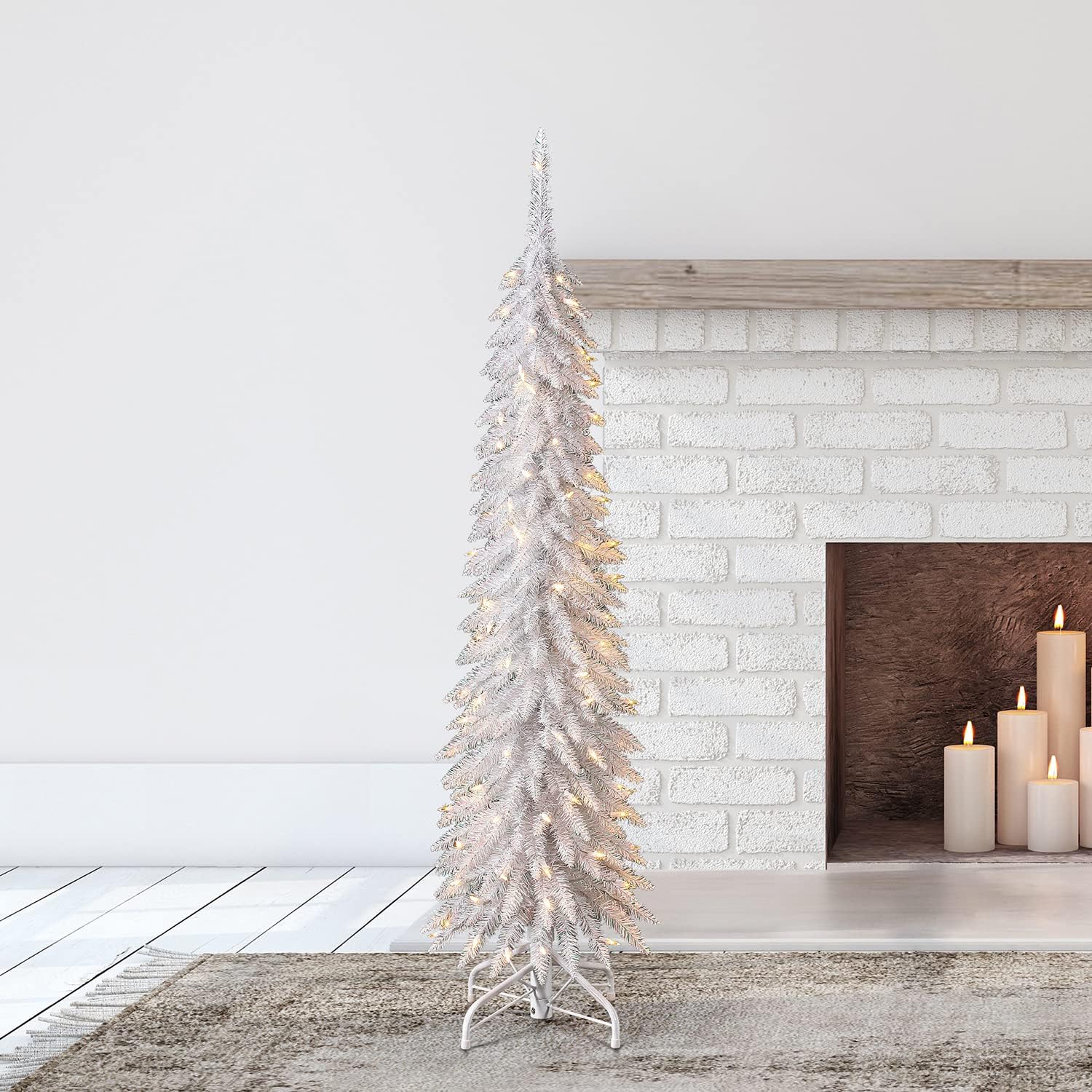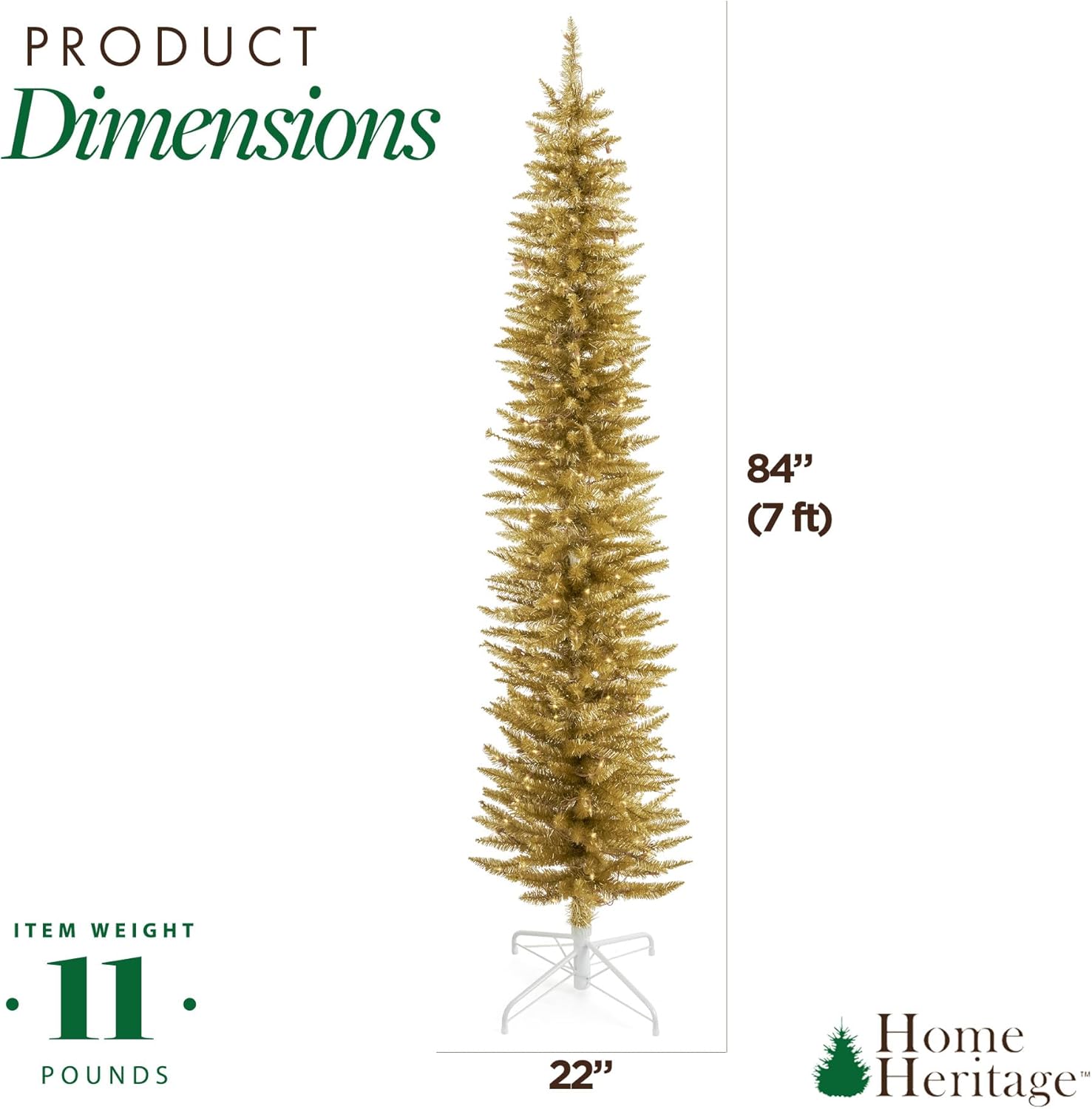 Bring the magic of your holidays home with the Home Heritage Pre-Lit Artificial Christmas Tinsel Tree. Standing tall at 9 feet, this medium-sized tree is designed to effortlessly infuse your living space with festive cheer. It's adorned with 673 lush tinsel branch tips to create a stunning Winterland to embrace beautiful holiday decor to enjoy throughout the season. Measuring 108 inches tall and 30 inches wide, this pencil tree is the perfect choice for compact spaces or as part of a group arrangement without the worry of shedding needles. Whether it's placed in a cozy apartment or showcased in a grand foyer, its slim profile ensures versatile placement options while maintaining a full and festive appearance. It's equipped with 250 warm white LED lights that cast a captivating glow and enhance any room. This skinny Christmas tree with lights comes with a metal stand that provides sturdy support. It's easy to assemble and dismantle as needed to make the holiday season a joyous time for those who love decorating. Create lasting memories with the Tinsel Tree, an essential centerpiece for joyful gatherings and cherished holiday traditions. Its realistic design, easy setup, and enchanting illumination make it a delightful addition to any home. Enjoy the holiday traditions and decorating with loved ones.