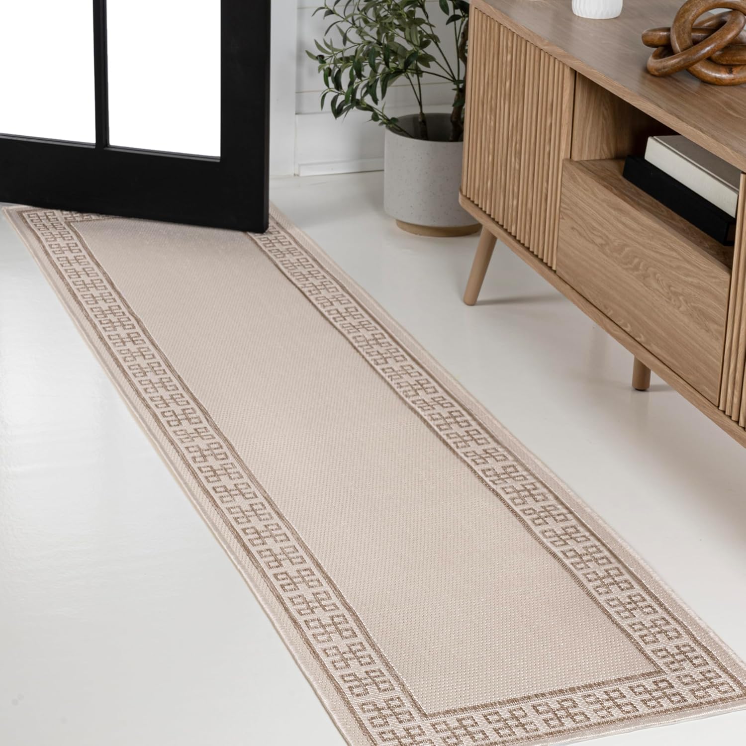 Our geometric border rug has a wide patterned stripe around the edge with a plain center field. It's woven from durable synthetic fibers in a two-tone design. Use this easy-care, family-friendly rug on the porch or deck, or in high traffic spaces like a living room, dining room or entry.