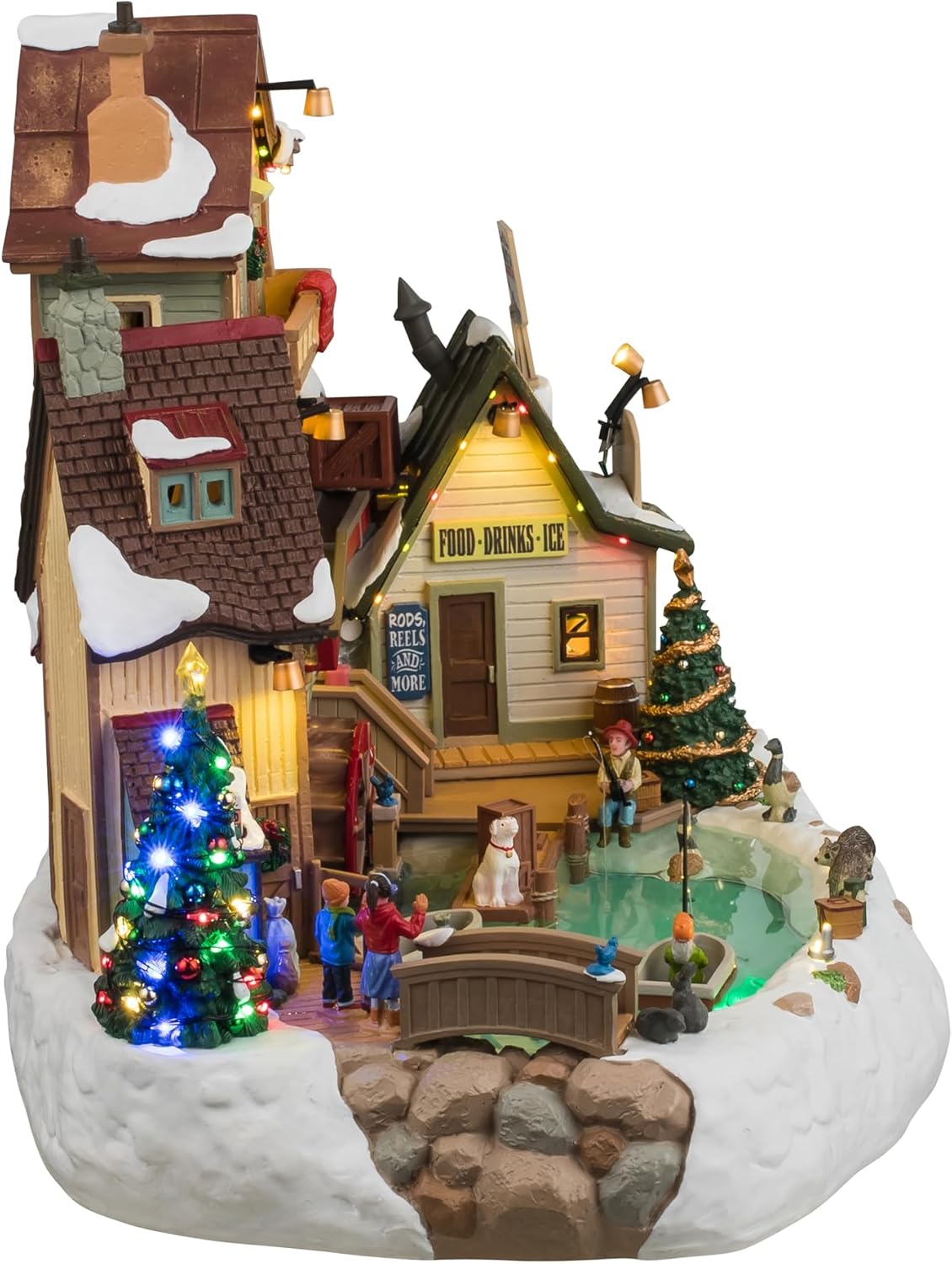 This is a Lemax Collectable Animated Building, from the new 2025 Collection. In the heart of Harvest Crossing, you will find the charming Rocky River Grist Mill. Decorated with charming Christmas ornaments, this lovely spot offers not just delicious food and drinks, but quality flour milled with care. As people wander the scenic surroundings, two men peacefully fish by the river, adding to the tranquil ambiance. It’s a picturesque scene of warmth, community, and long-lasting traditions.