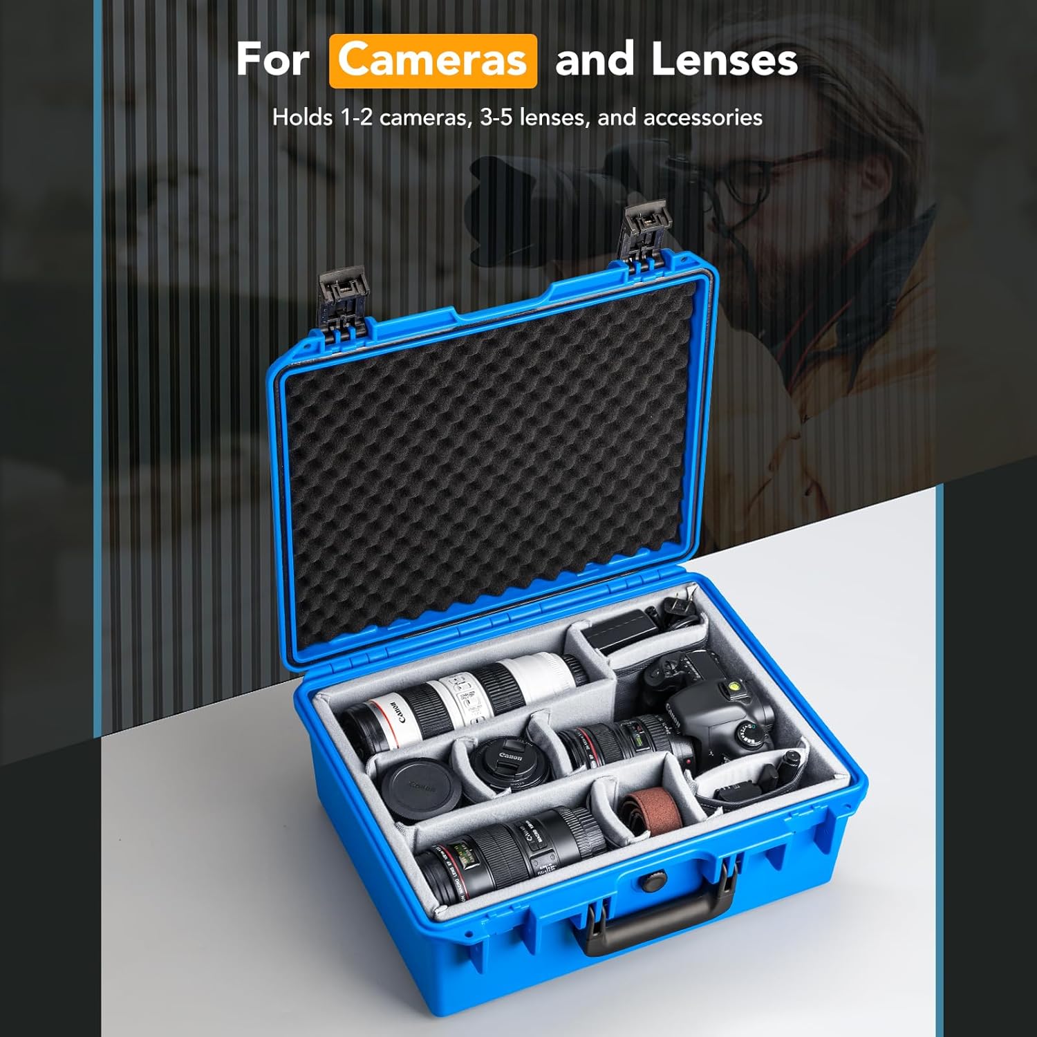 This rugged hard case is a versatile storage and transportation solution for professional photographers and videographers. Its waterproof construction protects DSLR, mirrorless cameras and drone equipment from dust, water splashes and other outdoor elements. Removable, fully customizable dividers allow users to configure the interior compartments to securely store cameras, lenses, drones and accessories in any arrangement. Padded protection on all sides of the durable, high-density materials ensure a full equipment kit remains safe and protected for any shoot, whether in the field or studio, urban or remote locations. The hardy exterior and heavy-duty reinforced construction provide peace of mind for photographers, videographers and content creators to focus on the job while knowing their valuable gear is well-shielded from potential impacts and environmental hazards.