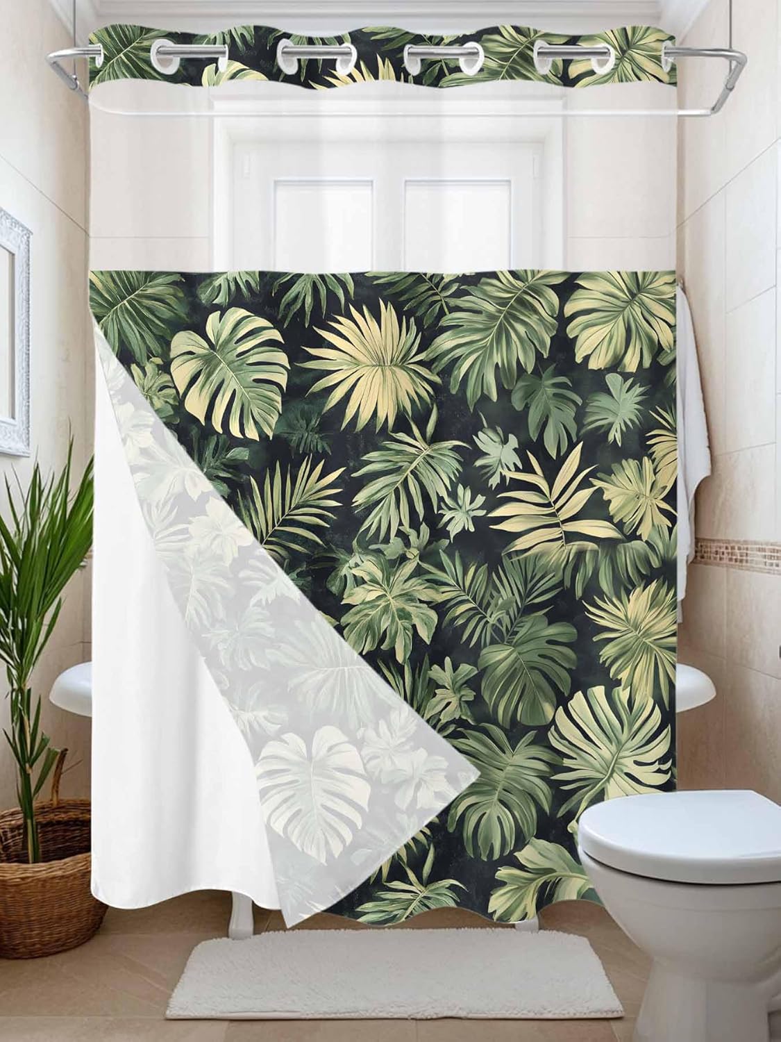 No Hook Shower Curtain with Snap in LinerWaterproof Bath Curtain Size ▸36x72 inches (about 91x183cm)▸36x78 inches (about 91x198cm)▸48x72 inches (about 122x183cm)▸54x78 inches (about 137x198cm)▸60x72 inches (about 152x183cm)▸66x72 inches (about 168x183cm) ▸72x72 inches (about 183x183cm) ▸72x78 inches (about 183x198cm) ▸72x84 inches (about 183x214cm) ▸72x96 inches (about 183x244cm) Easy to Install▸Our shower curtain is designed with an open grommet top, which can be easily installed without hooks, and can be hung and slid smoothly. The no-hook shower curtain comes with a snap liner, and the replaceable snap liner is easy to remove and clean. Mindful Workmanship▸The luxury hotel style bath curtain is made of carefully selected polyester fabric, which is soft to the touch. Both the shower curtain and liner set are waterproof, allowing water to slide off and dry quickly. Privacy & Breathable▸The semi-transparent mesh on the top of the shower curtain allows light to enter while allowing air to circulate. The double-layer bath curtain maintains privacy while being breathable, creating a spa shower experience. Fashionable Gift▸The bathroom shower curtain uses advanced high-definition printing technology and it is not easy to fall off and fade. The waterproof bath curtain is very suitable for family, friends and other holiday gifts, such as 4th of July, Independence Day, Halloween, Thanksgiving, Christmas, etc. How to Clean▸This shower curtain with snap in liner can complement any style and decoration and is not easy to get dirty. Machine washable in cold water, hang to dry. Do not bleach. It can be dried quickly after washing and is easy to care for. Quality Assurance▸If you have any questions, please feel free to let us know, we will give you a satisfactory reply within 24 hours.