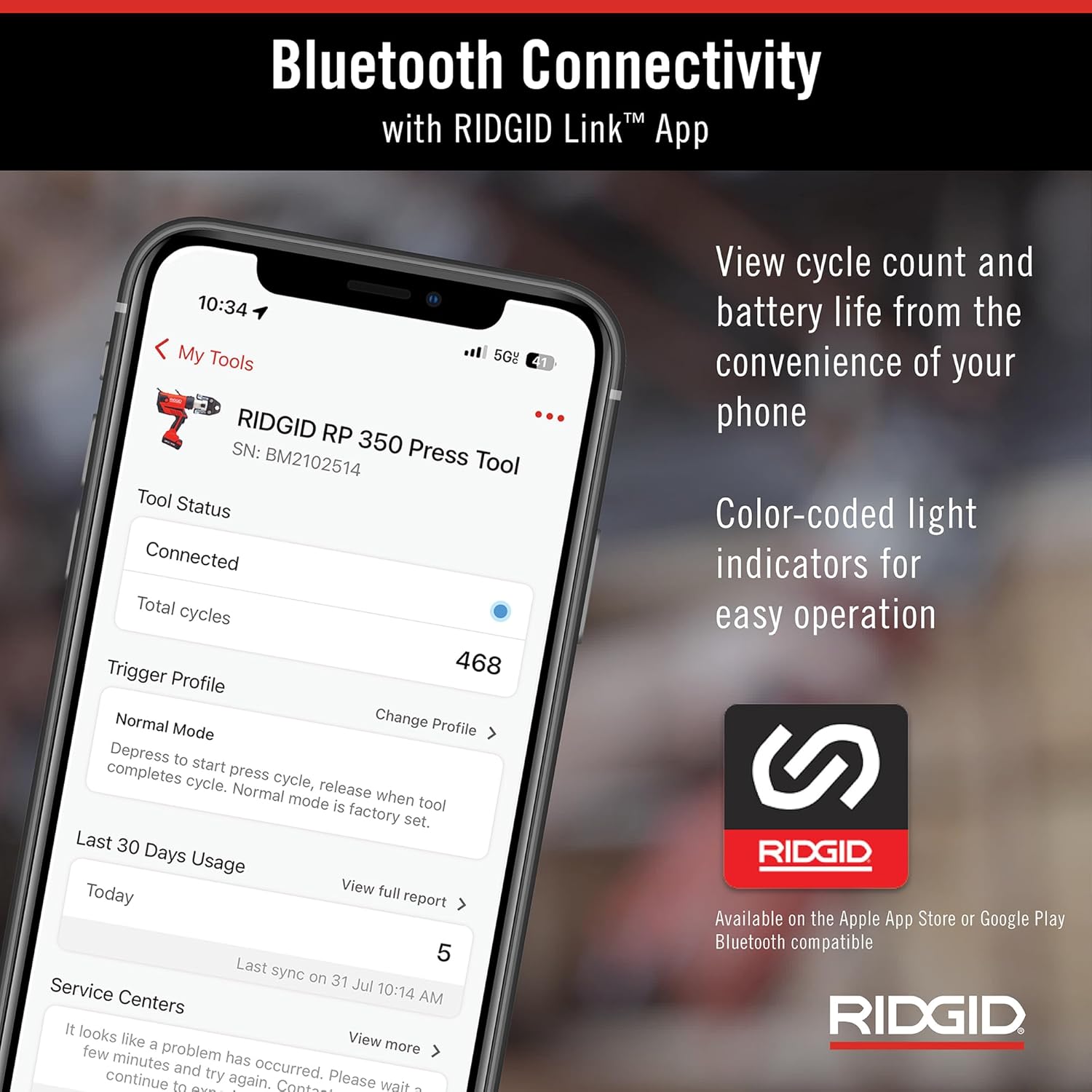 Master your jobs with ease and accuracy with the RIDGID Model RP 350 ProPress Press Tool (catalog number 67053, model RP 350). Designed for plumbing experts, this press tool is the only press tool compatible with all RIDGID Standard Series jaws, rings, actuators, and attachments. The durable, brushless motor is capable of performing over 100,000 press cycles for a long tool life, and the press tool requires no scheduled maintenance. Featuring an agile 360-degree head swivel, the press tool offers superior flexibility in tight spaces. It's made with the most advanced LED interface and bright, robust lighting for convenience when working in low-light areas on the jobsite. Designed for maximum performance, the press tool features Bluetooth connectivity and easy color-coded light indicators to make operation simple. This press tool kit includes the RIDGID RP 350 ProPress Press Tool, 4 ProPress Jaws (1/2" to 2"), an 18-volt battery, charger, and a rugged carrying case. RIDGID is a global manufacturer trusted by the skilled trades in more than 100 countries. BUILT FOR THOSE WHO KNOW.®.