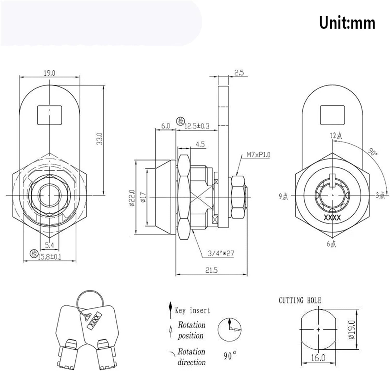 Locks & LatchesGate LocksItem:1001XS Lock Type:Cabinet CamLockKey Type:Tubular LockMaterial:Zinc AlloyFinished:ChromeKey Combination:SameKey Gross Weight:75g/pcsPackage:PP BagAccessories:Lock*1pcs Key*2pcs Hook*1pcs
