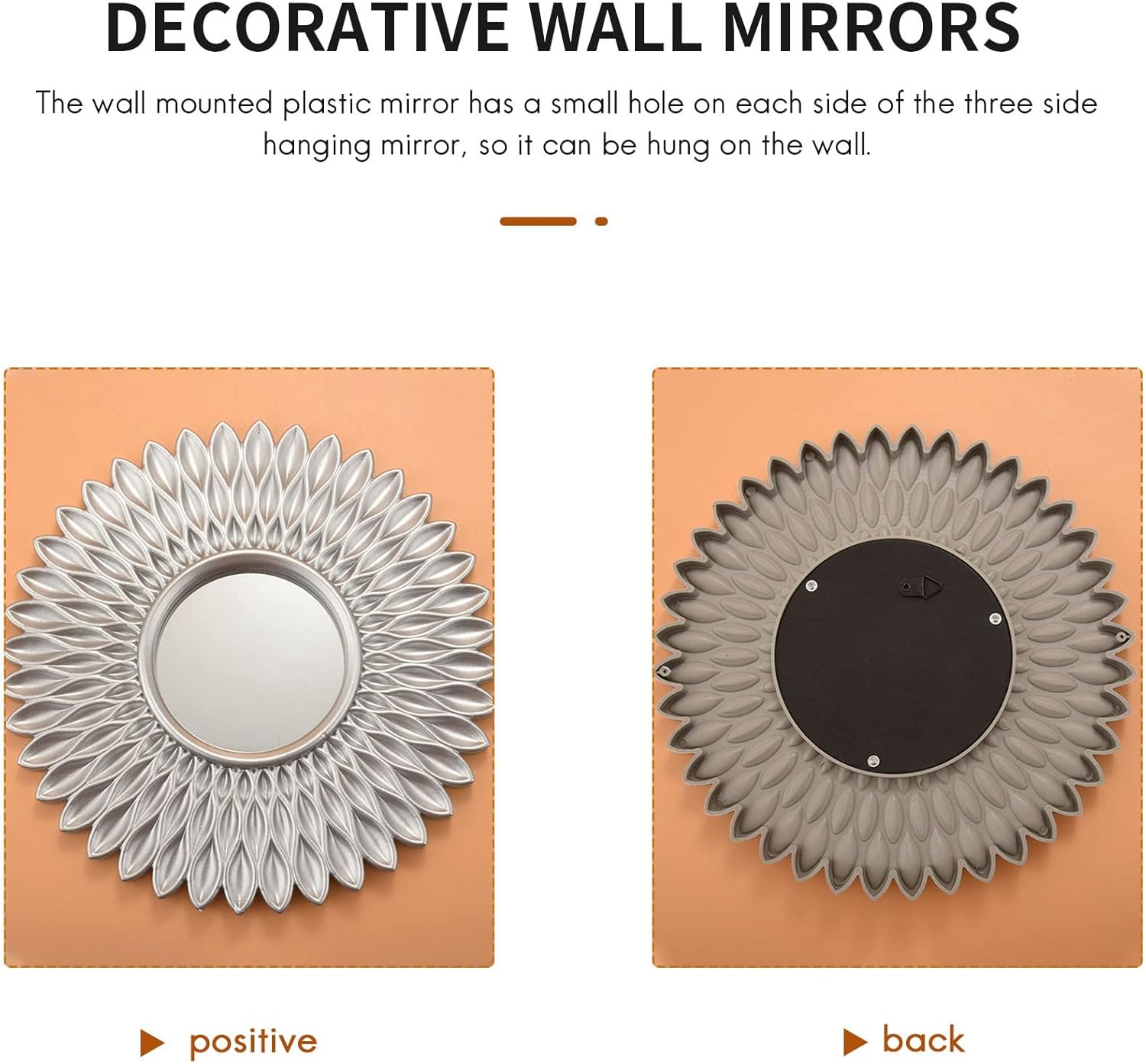 ALOEU Two different types of mirrors, two in the shape of sunrays and one with a more rounded .Each mirror includes a small eyebolt to easy to hang .Plastic frame, sturdy material.COLOR: SilverMaterial: PVC+lensPackage Contents:3 x Decorative mirrorOnly the above package content, other products are not included.Note: Light and different displays may cause the color of the item in the picture a little different from the real thing. The measurement allowed error is +/- 1-3cm.