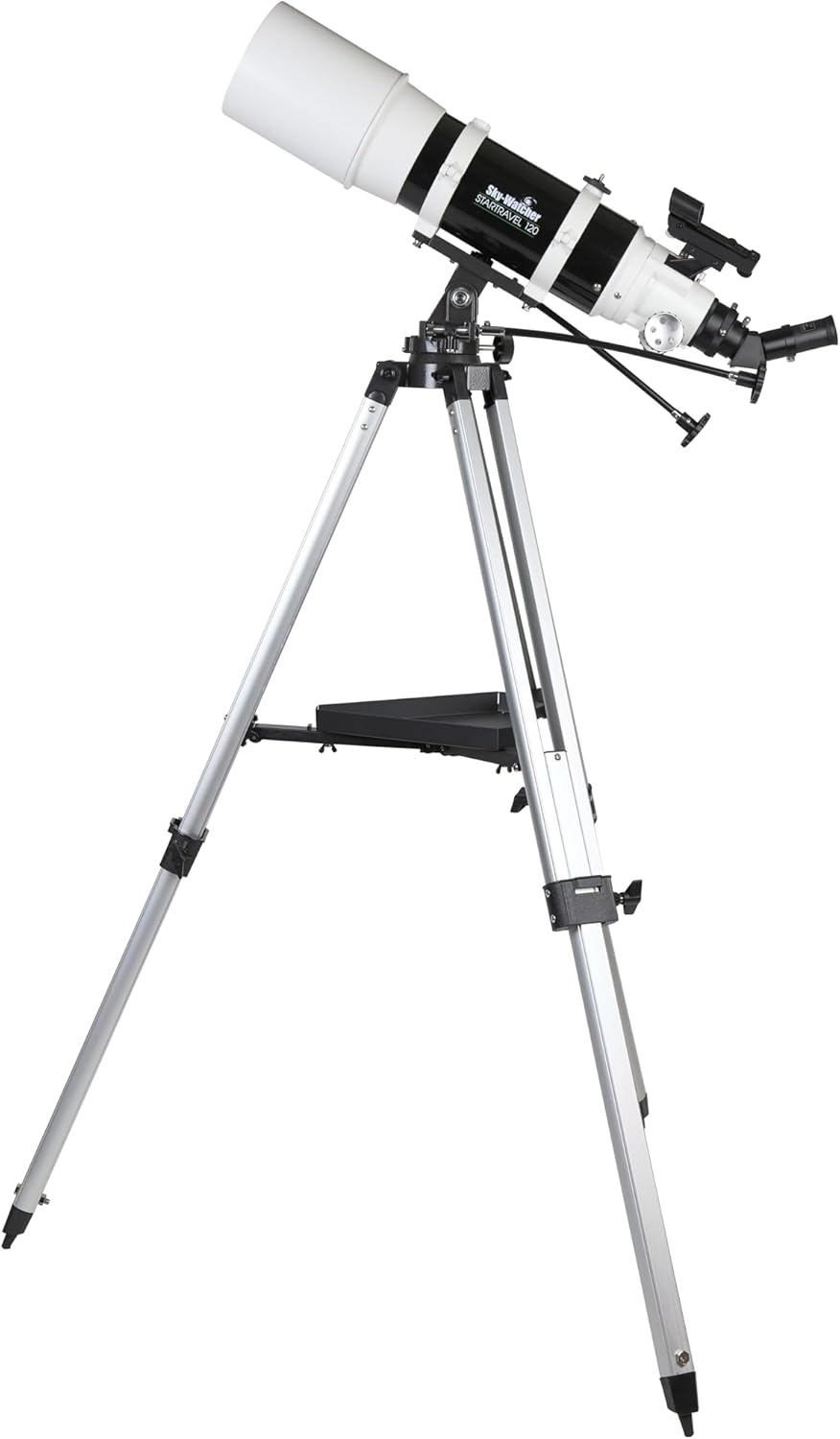 This Sky-Watcher 120mm (5") f/5 StarTravel telescope is a two-element, air-spaced, fully multi-coated objective achromatic refractor giving exciting "rich field" astronomical views. It provides excellent vistas of star fields, clusters, nebulae, galaxies, planets, the Moon and (with correct filtering or by projection) the Sun. It is also a fine terrestrial telescope when used with the provided 45 ° correct-image prism to correct for optical flip. Crisp images at a reasonable price make it an excellent beginner's "first telescope" or a great travelling telescope for the more advanced observer. When compared to similar 80mm f/5 refractors this larger aperture model has more light collecting power at the same focal ratio and accepts 2" diagonals for awesome wide field views with only a slight amount of chromatic aberration. Weighing only 8.6 pounds and only 22 inches long the optical tube assembly (telescope) is incredibly portable. Being a refractor it is quick and easy to set up and the low- maintenance enclosed optics come fully collimated from the factory. The optical tube assembly comes with "tube mounting rings". These open to allow easy installation of the tube. The locks can be loosened during use to allow tube rotation and balancing. The included AZ3 adjustable aluminum alt-az tripod combines easy portability with stability. Slow-motion controls on both the vertical (altitude) and horizontal (azimuth) axes for precise targeting. The large accessory tray provides a convenient storage place for eyepieces and other gear. StarTravel kits come with a 1 ¼ inch 45° erect image prism, 10 and 25mm super eyepieces, and red dot finder. The AZ3 mount has geared slow motion controls, adjustable aluminum legs, and an 11-pound payload capacity while weighing only 8 pounds.