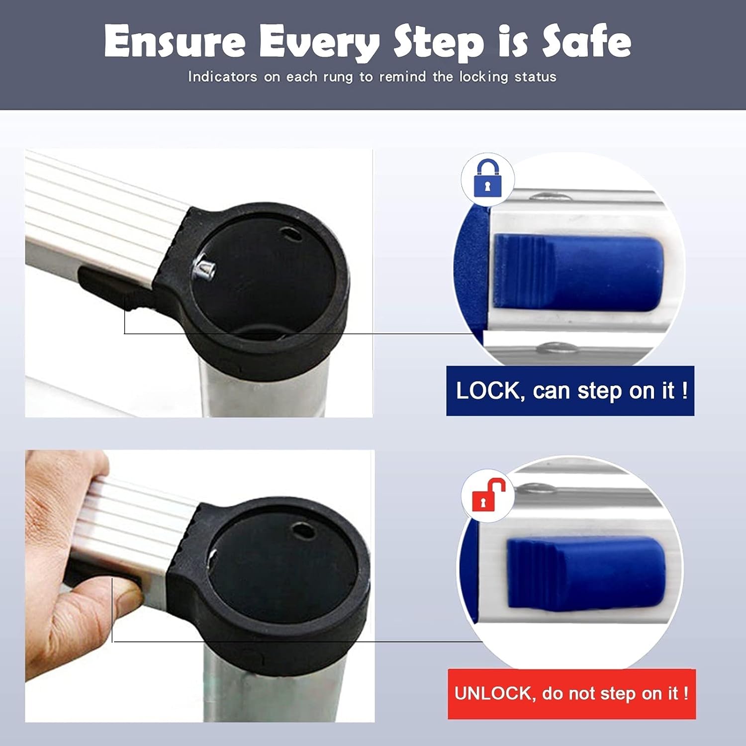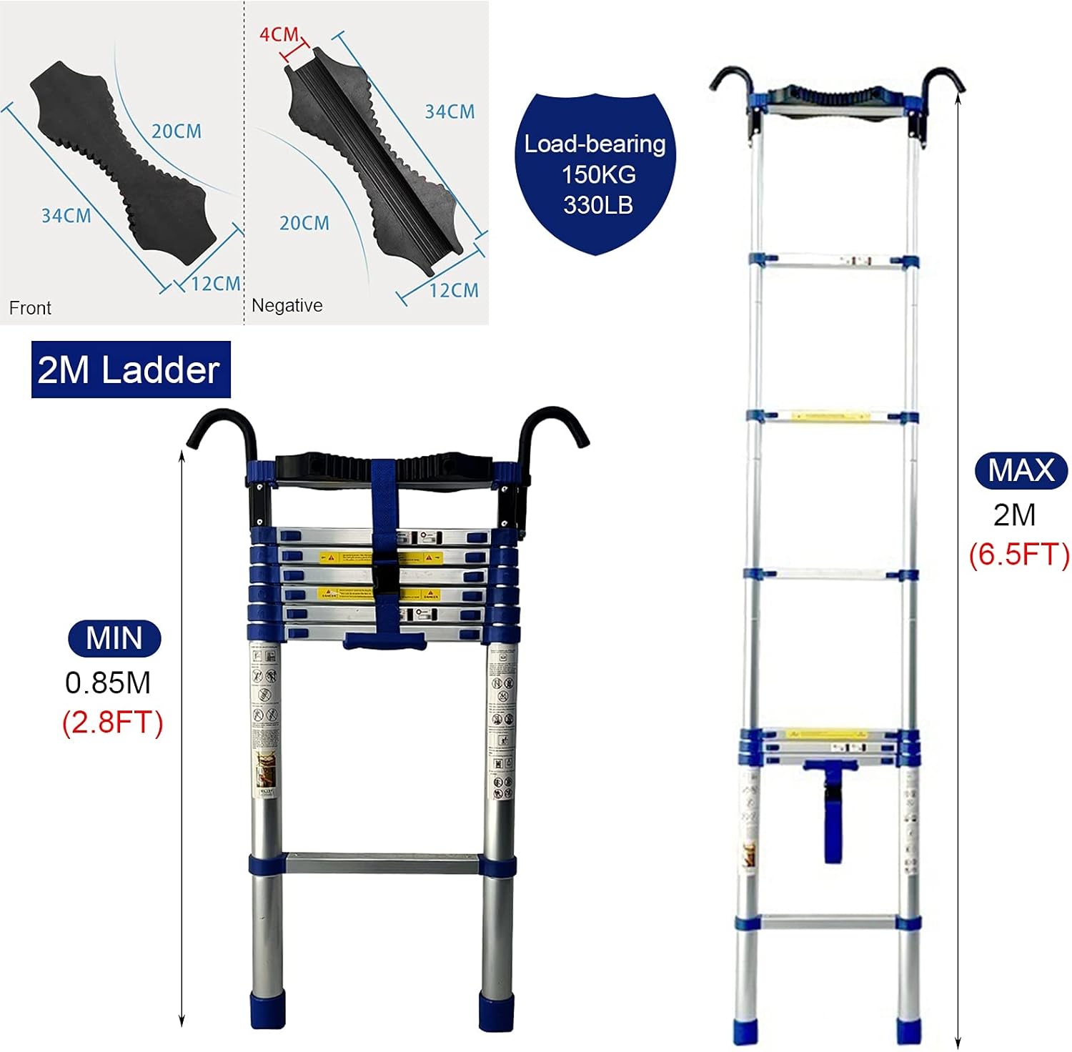Lightweight Durable Extendable Ladder is Designed with Safety in Mind. Not Safe Absolutely not! The non-slip foot pad ensure your safety during use. Our ladder has wider texture steps than the comparable multi-use ladders.Specification:Product Name: Telescoping LadderPedal Width: 8cm/3.15inLoad: 150 kg/330 lbsUnfolded Size: (Optional) 2m/6.5feet , 2.4m/7.8eet , 2.8m/9.2feet , 3.2m/10.5feet , 3.6m/11.8feet , 4m/13.1feet , 4.4m/14.4feet , 4.7m/15.4feet , 5.1m/16.7feet , 5.5m/18feet , 5.9m/19.3feet , 6.3m/20.6feetFeatures:Made of aluminium alloy, strong and durable.This ladder can be quickly extended and adjusted.Extendable ladder with rubber washer & hooks.Portable and convenient for storing.The aluminum tubes overlap and lengthen, the lengther the overlap, the stronger.Be suited for outdoor and indoor.Whether you are a professional contractor or just ticking off the chores at home, telescopic extension ladder is your good partner.Package Included:1 x Telescoping LadderTips:Do not put your hands or fingers between the rungs while retracting to avoid pinching.One-Make sure that the safety lock on both sides of each step are locked firmly before you can climb the ladder.The use of different heights must be fully opened on the top, and kept in the contracted state below (Cannot be used if the middle part is opened or closed or cannot be pulled in place).