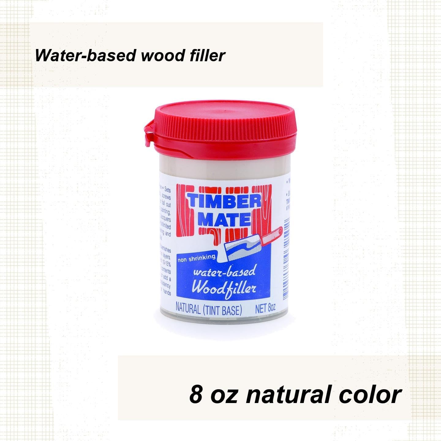 A totally unique, quick drying, water based grain filler and wood putty accepts stain beautifully or can be tinted. Never goes bad Easy to apply and clean up No shrinking, cracking or falling out. Does not become permanent until you apply a finish. If you're ever unhappy with the way it looks, the color, etc. – just water it down and remove it. If it freezes, simply put it in the microwave to warm it up or if it dries out, just stir in water. This allows for zero waste! This might just be the perfect wood filler. Manufacturer recommends using only stainless steel or plastic tools to apply because Timbermate may react with low grade steels and turn black. If this happens, simply add water and remove it, or wait for it to dry and sand it off.