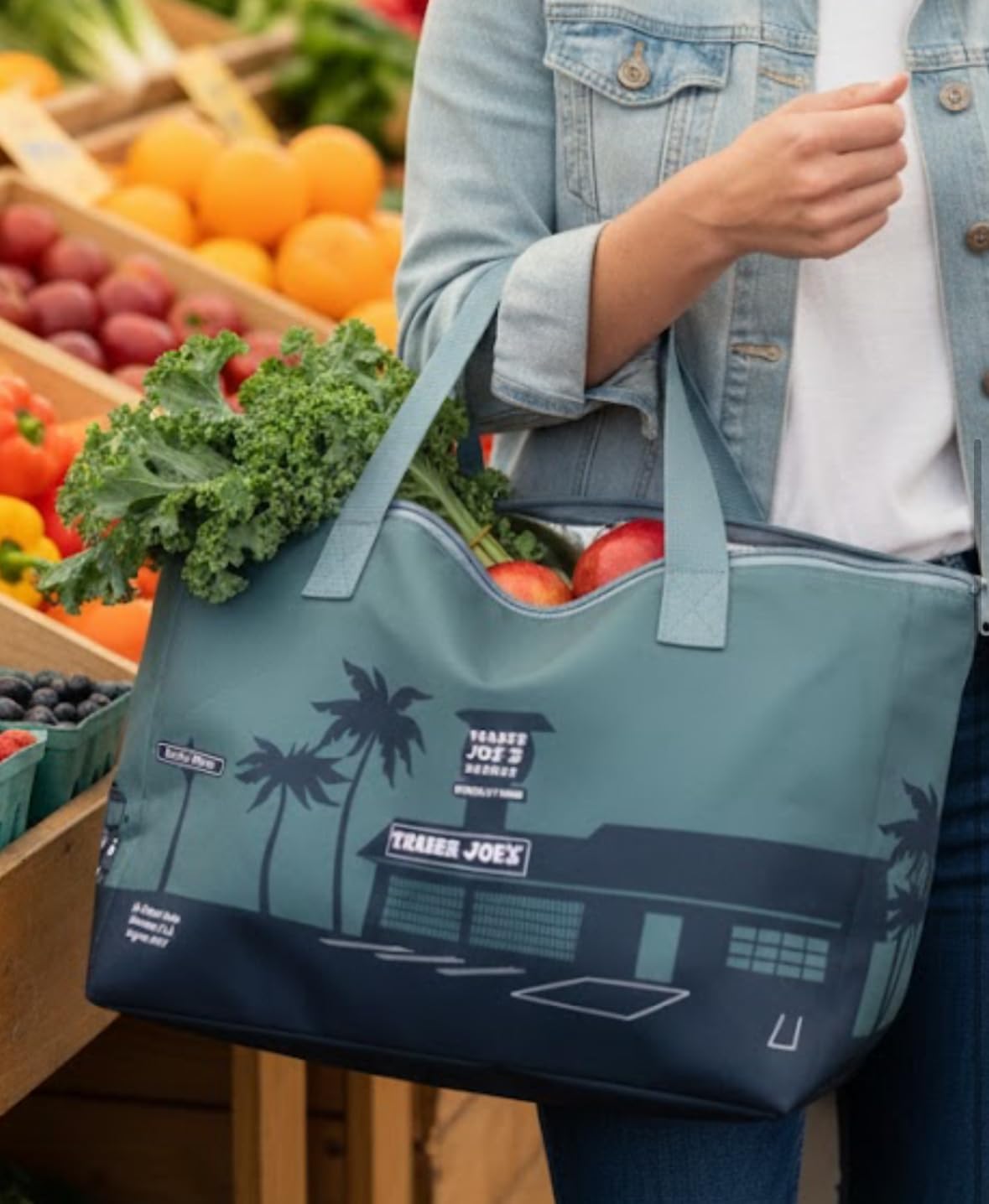 Make your grocery shopping more stylish and sustainable with this spacious Trader Joe's insulated tote bag. The olive green bag features a charming palm tree silhouette design and sturdy construction perfect for carrying groceries, produce, and frozen items. With durable carrying straps and a generously-sized main compartment, this versatile tote keeps your items at their ideal temperature while you shop and transport them home. The bag's insulated lining helps maintain freshness, while the zip-top closure ensures secure storage. The practical design includes reinforced stitching and high-quality materials built to handle regular use. Whether you're doing a weekly grocery run or picking up a few essentials, this insulated tote combines functionality with Trader Joe's signature style.
