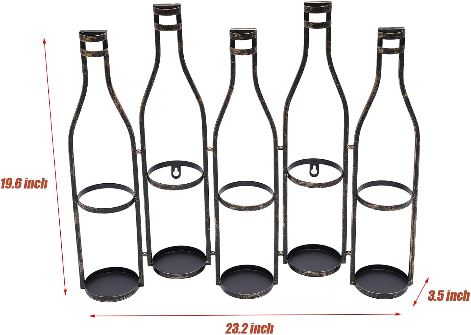 FeaturesThis is a beautiful vintage wall-mounted wine rack, it is made of high-quality iron. This wall-mounted wine rack is solid and durable.Putting the wine on the wall-mounted wine rack not only saves your storage space but also is very easy to access.The wine rack surface is coated with golden powder, waterproof and rust-proof. So the rack will look very new even after a long time of use.It is suitable for families, bars, cafes, hotels, restaurants, offices, kitchens, commercial cellars and various high-end clubs.SpecificationsMaterial: IronColor: BronzeProduct Size: 23.2"L x 3.5"W x 19.6"HCapacity: 5 Bottles of WineNet Weight: 1.2kg/2.6lbsPackage Included: 1* Wine Rack