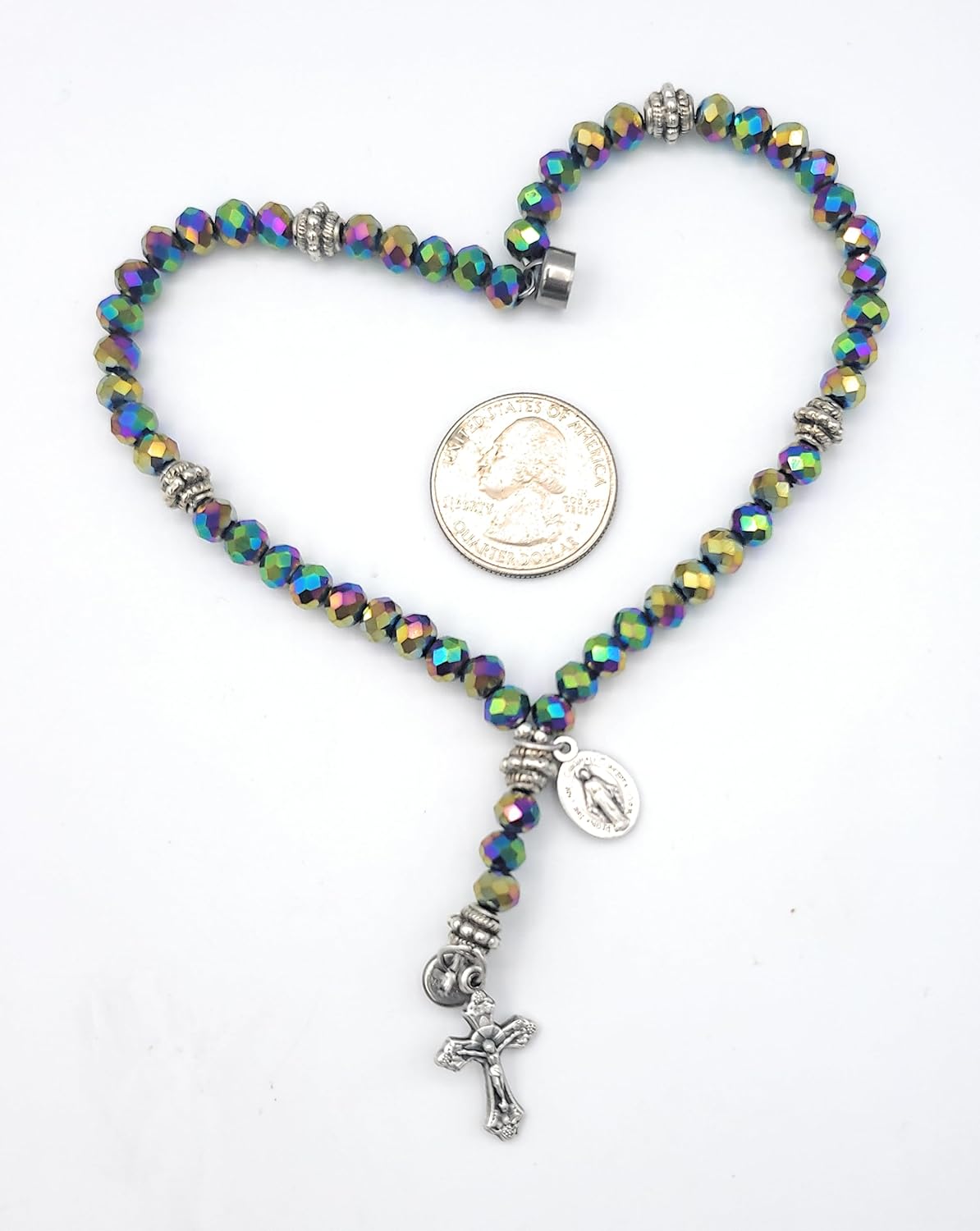 The Wrist Rosary is the original design of MG Rosary, a tiny, complete 5 decade rosary that has a magnetic clasp in the center of the third decade so it can be worn as a bracelet and easy to remove for prayer. The strong magnet will not come open on its own, the tension must be broken with a fingernail or it must be slid apart. The Rosary is the weapon for these times (St. Pio of Pietrelcina). Open carry your spiritual weapon! 6X5mm crystal beads are enhanced with a chiny rainbow coating. Stainless steel magnet casing ensures long wear.