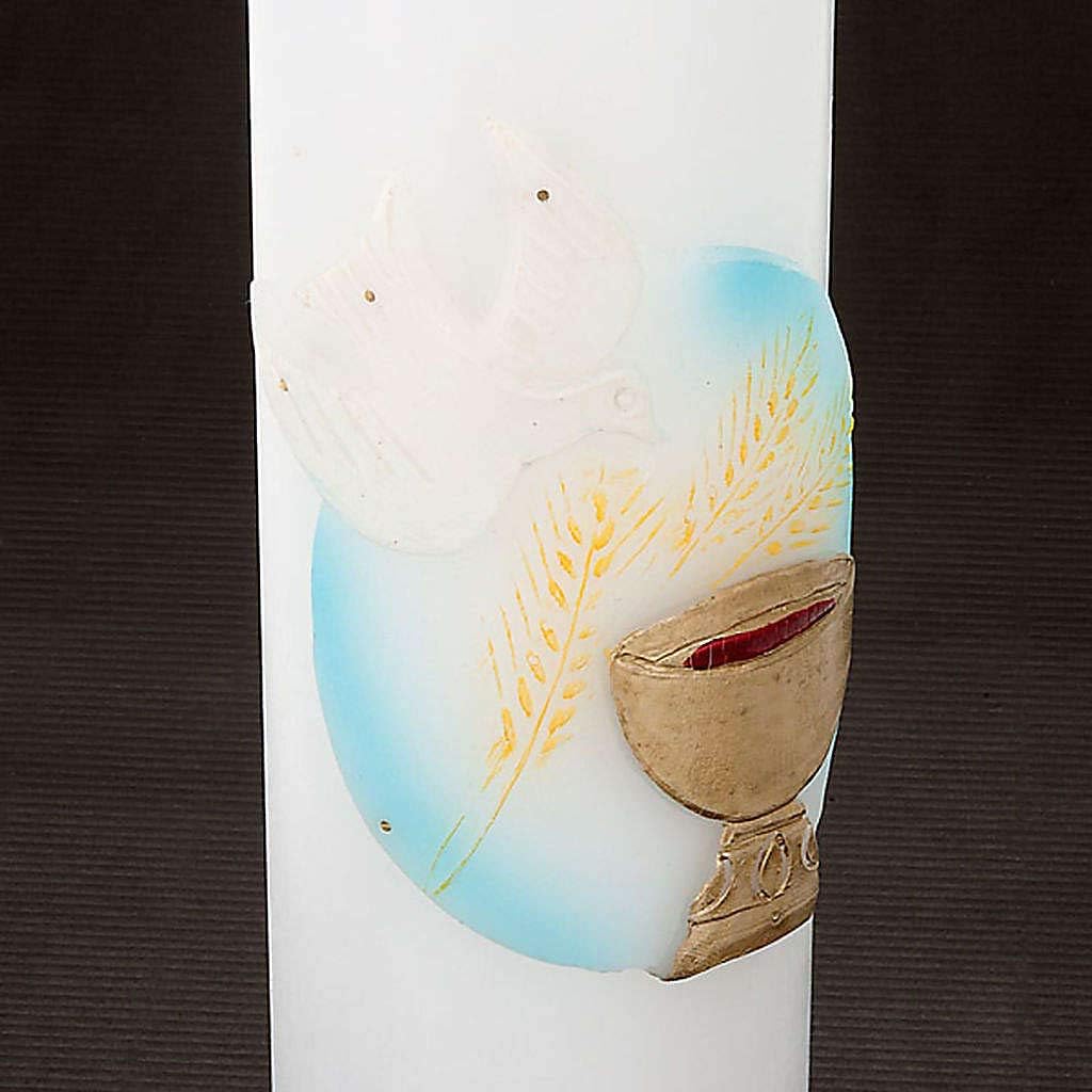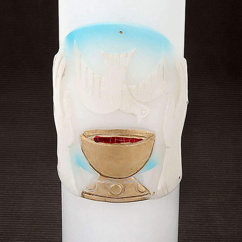 Altar candle with bas relief decorations. White wax candle available with the following decorations: (1) Risen Christ, (2) Chalice, dove, hands, (3) Chalice, dove, ears of wheat. Choose the decoration number below the picture Weight: 1.50 g - Article Size: Height: 30 cm|Width: 8 cm - Article Materials: cire blanche - PRODUCT CODE: CN001002
