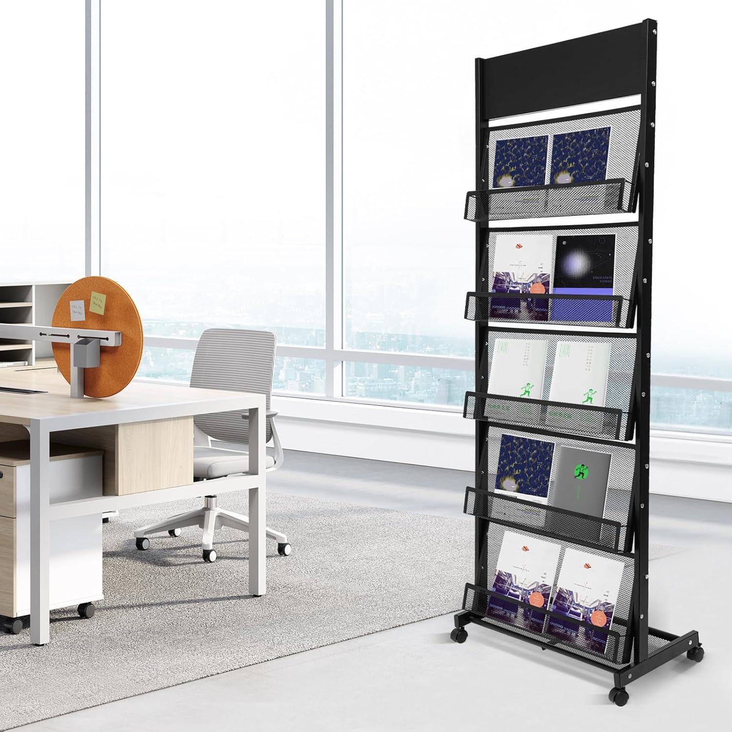 DetailsL-shaped Structure: It makes the product more stable and easy to show.Practical Screwdriver & Spanner: They facilitate your installation and save you time searching for tools.Top Area: You can use it to display company logos and promotional slogans to provide a general introduction to the specific content of your brand or display magazine, making it easy for readers to quickly understand the relevant information of the displayed magazine.ApplicationThis product is suitable for shops, Christmas-themed shops, offices, living rooms, study rooms, meeting rooms, classrooms, cafes, libraries, garages, shopping malls, supermarkets, gift shops, and more. It can also be used to organize greeting cards, letters, documents, newspapers, magazines, books, mail, brochures, postcards, gift cards, etc.SpecificationsColor: BlackStyle: ModernShape: RectangleMaterial: Iron Process: Baking Paint, Electrostatic SprayingMount Type: Free StandingAssembly Required: YesNumber of Tiers: 5Applicable Paper Size: A4, A3Max. Load-bearing Capacity: About 50kg/110.23 lbsNumber of Universal Wheels: 4 (Two with Brakes)Product Size: 70*35*179 cm/28*14*70 inPackage Size: 91*51*13.5cm/35.82*20.08*5.31 inGross Weight: 7kg/15.43 lbsNet Weight: 6.5kg/14.33 lbsPackage Included1* Magazine Rack1* Screwdriver 1* Spanner2* Gloves4* WheelsOther Accessories for InstallationNotes1. Please note that this product only includes a rack without other items.2. Please check the size carefully before ordering.3. Please do not place overweight objects on the product, if you put too heavy, it is easy to break.