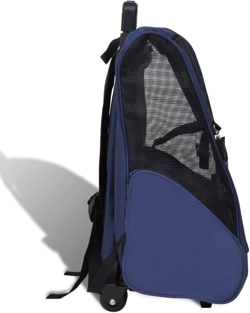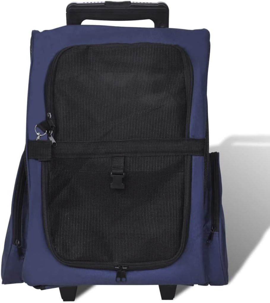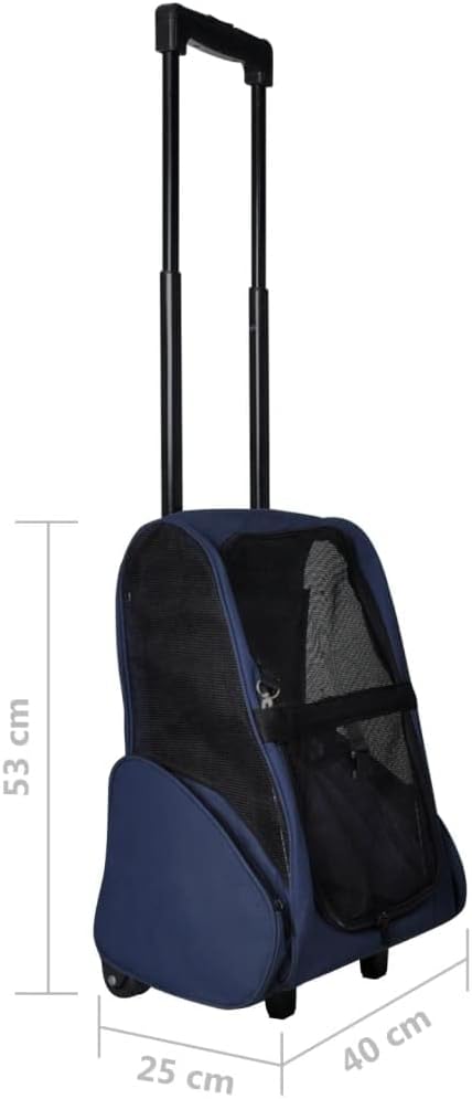 This pet trolley is lightweight and ventilated. It is designed for small pets like cats, dogs, rabbits, etc.Featuring an all-in-one design, this collapsible trolley can also be used as a pet backpack and a pet hand bag. It will really be a perfect choice for pet owners.This pet trolley is light and well-ventilated, with strong mesh windows on three sides, which makes it a comfortable shelter for your furry friend. The zippered doors can be rolled up or down, which makes it easy for your pet to get in and out. This pet trolley also boasts 2 zippered storage pockets for carrying small items like toys, treats, etc.Made of high-quality metal and fabric, this pet trolley is very durable.Size: 15.7"x9.8"x20.9" (L x W x H)Handle length: 19.7"Load capacity: 22 lbColor: BlueMade of washable and waterproof fabricWith a sturdy metal frameCollapsible for easy storageFeaturing:2 x Zippered pocket2 x Shoulder strap2 x Zippered mesh door2 x Strong mesh windowFabric: Polyester: 100%