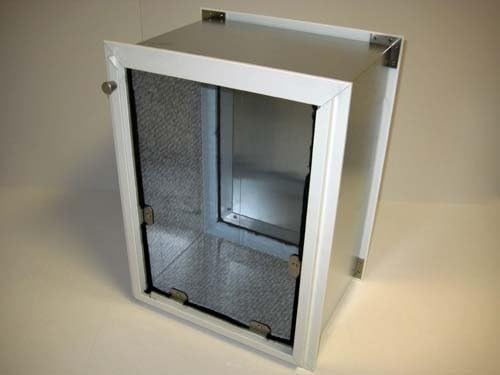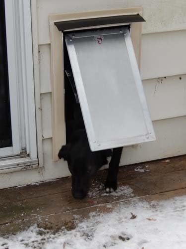 This SB72 Wall Mount model features an insulated rigid flap that is clad on both sides with aluminum and reinforced with rugged aluminum framing channel. The quiet swing action makes this ideal for use in your home. The exterior flap has been designed to perform in harsh or extreme environments. The door components are all high grade aluminum that is naturally rust resistant. The heavy duty internal hinge is stainless steel, housed in custom brass bushings. Our insulated flap is comprised of an inner polycarbonate, air cell center that is clad in aluminum, and reinforced with customized framing on all sides. Embedded rare earth magnets along the bottom of the flap and bottom framing align to provide for positive closing every time. Replaceable weather stripping lines all sides of the swing door frame. The solid 10" aluminum tunnel is trimmable, and can fit any wall depth from 2" to 10" deep (trim tunnel to fit your wall depth). The swing motion of the door is easy to use but not recommended for toy breeds or cats. Includes white top loading security panel. To receive a black or side sliding panel (left or right), or for wall depths greater than 10", please contact Moore Pet Supplies.